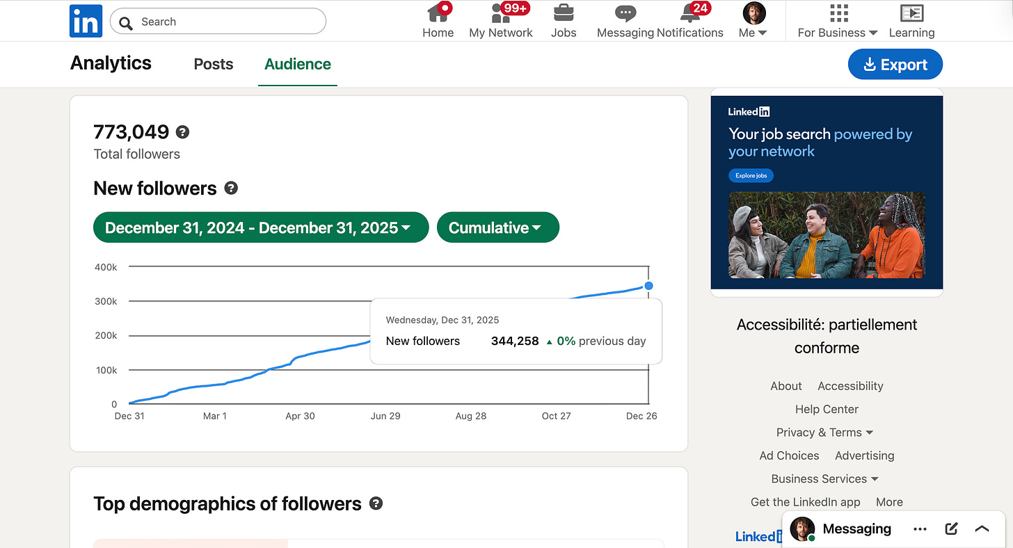 And I did the same with 5 different Linkedin accounts, organically, for a combined 1.56 million followers.