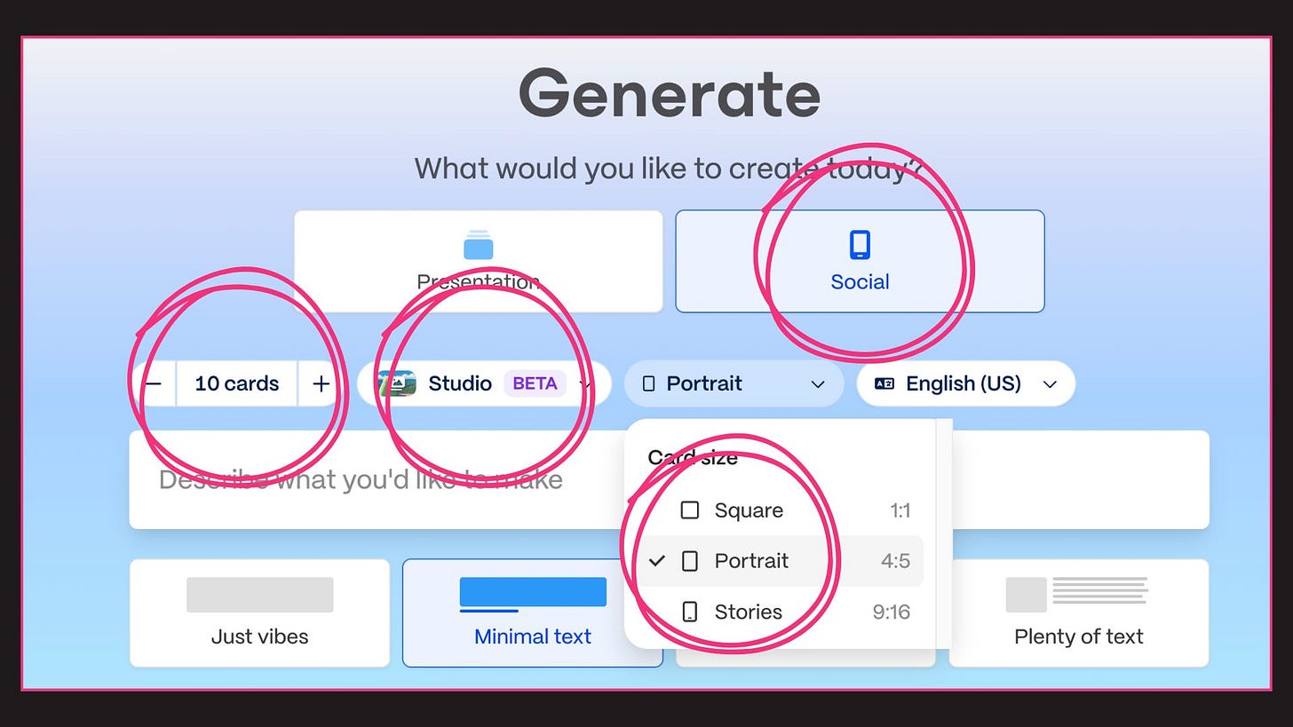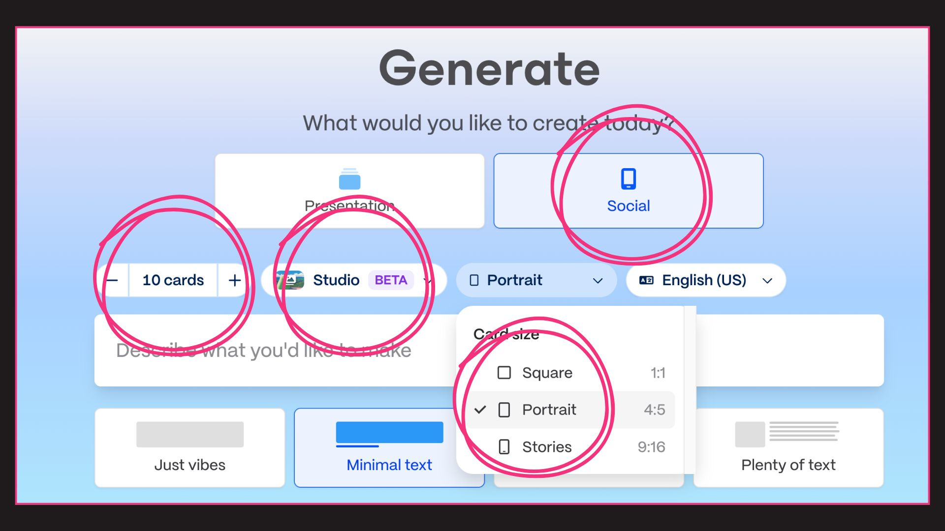 Make sure to select (1) social (2) 10 cards (3) Studio BETA (4) Portrait card size.