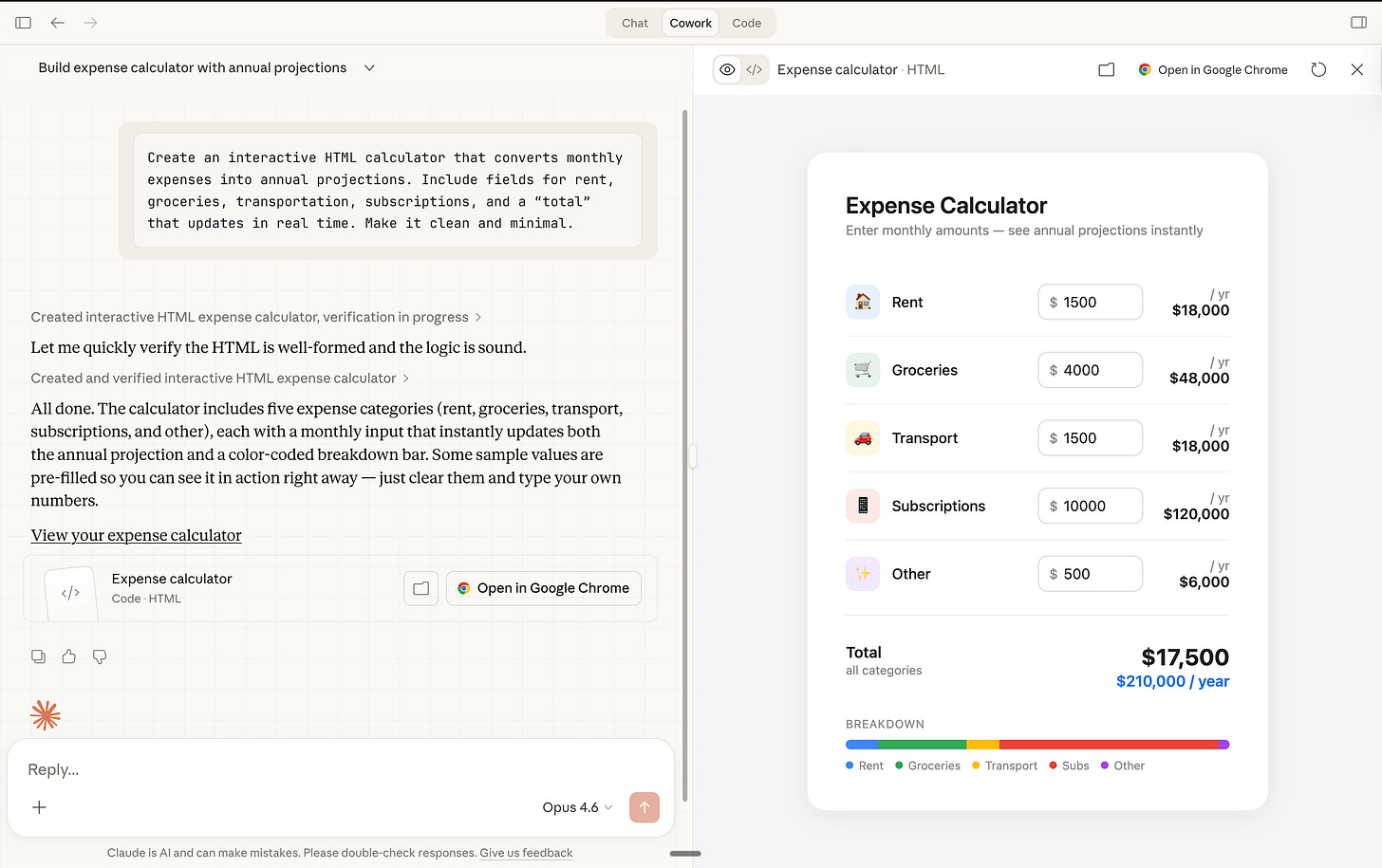 Create an interactive HTML calculator that converts monthly expenses into annual projections. Include fields for rent, groceries, transportation, subscriptions, and a “total” that updates in real time. Make it clean and minimal.Watch what happens. You get a working calculator inside the chat: