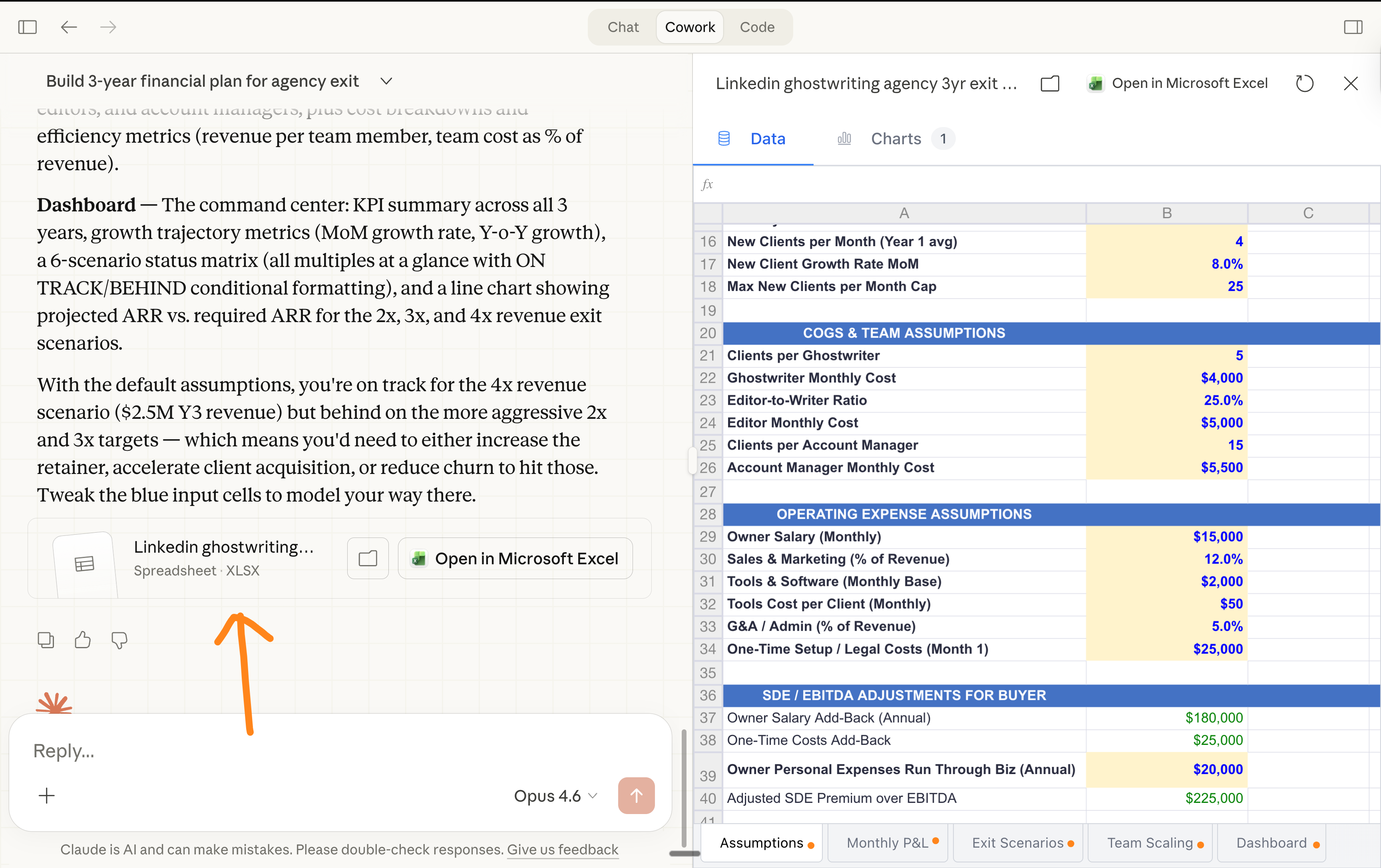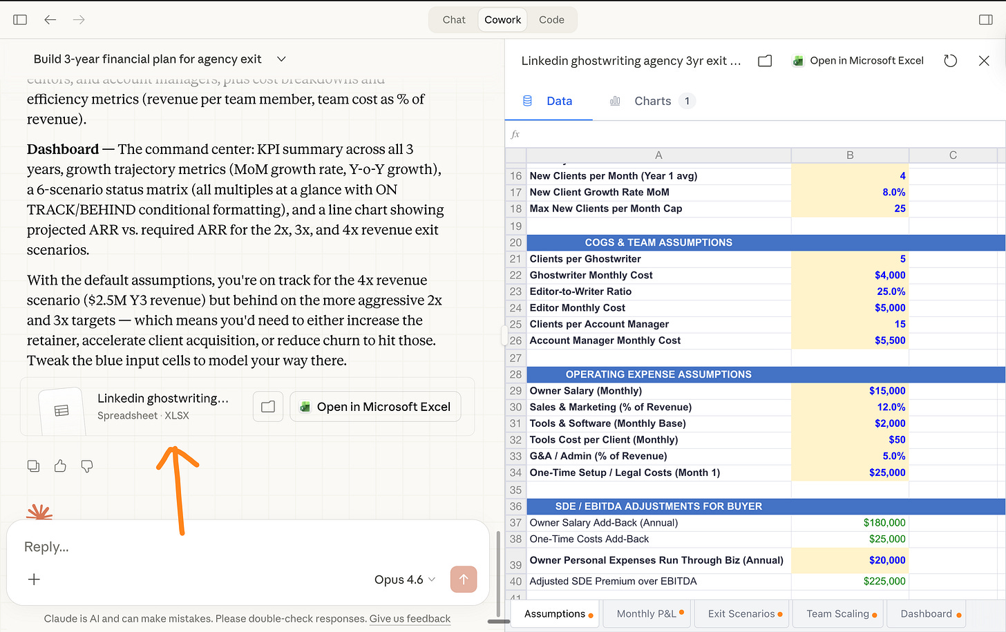 Or start a spreadsheet from scratch: → Start a new chat on Cowork → Ask it to “Start an Excel from scratch” → Challenge Claude → Iterate → Download the xlsx.