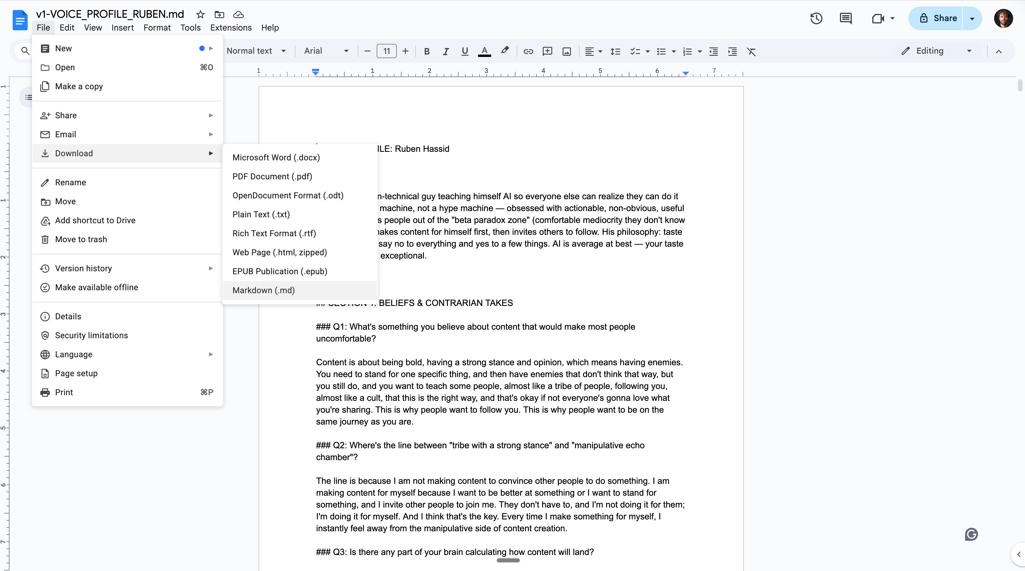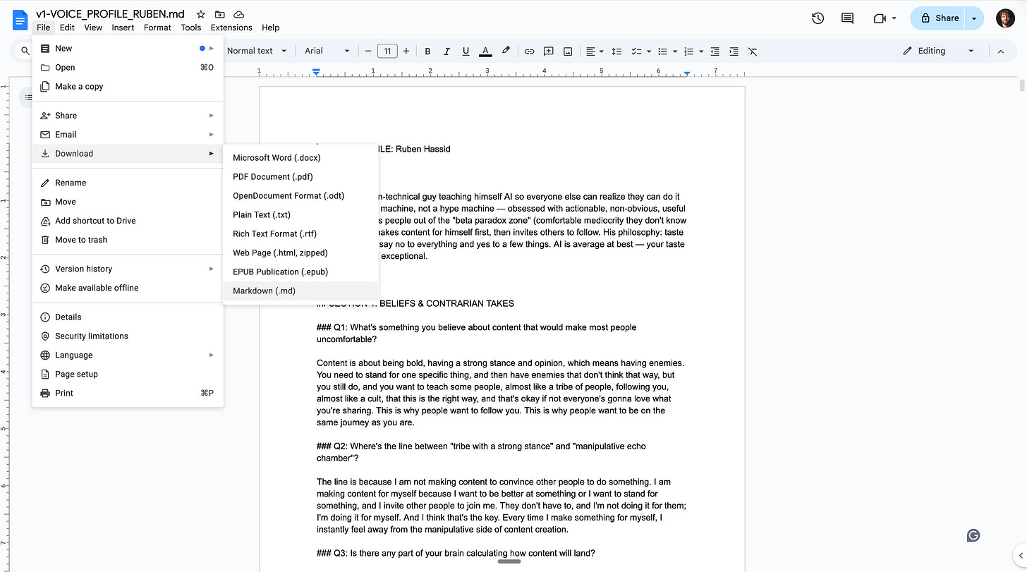 → Open any text editor (like Google Doc). Create a file called “about-me”. → Write 3 things: (1) What you do for work. (2) How you like to communicate (formal? casual? direct?). (3) One example of writing you’re proud of. Paste it in. → Save the file as a markdown file.