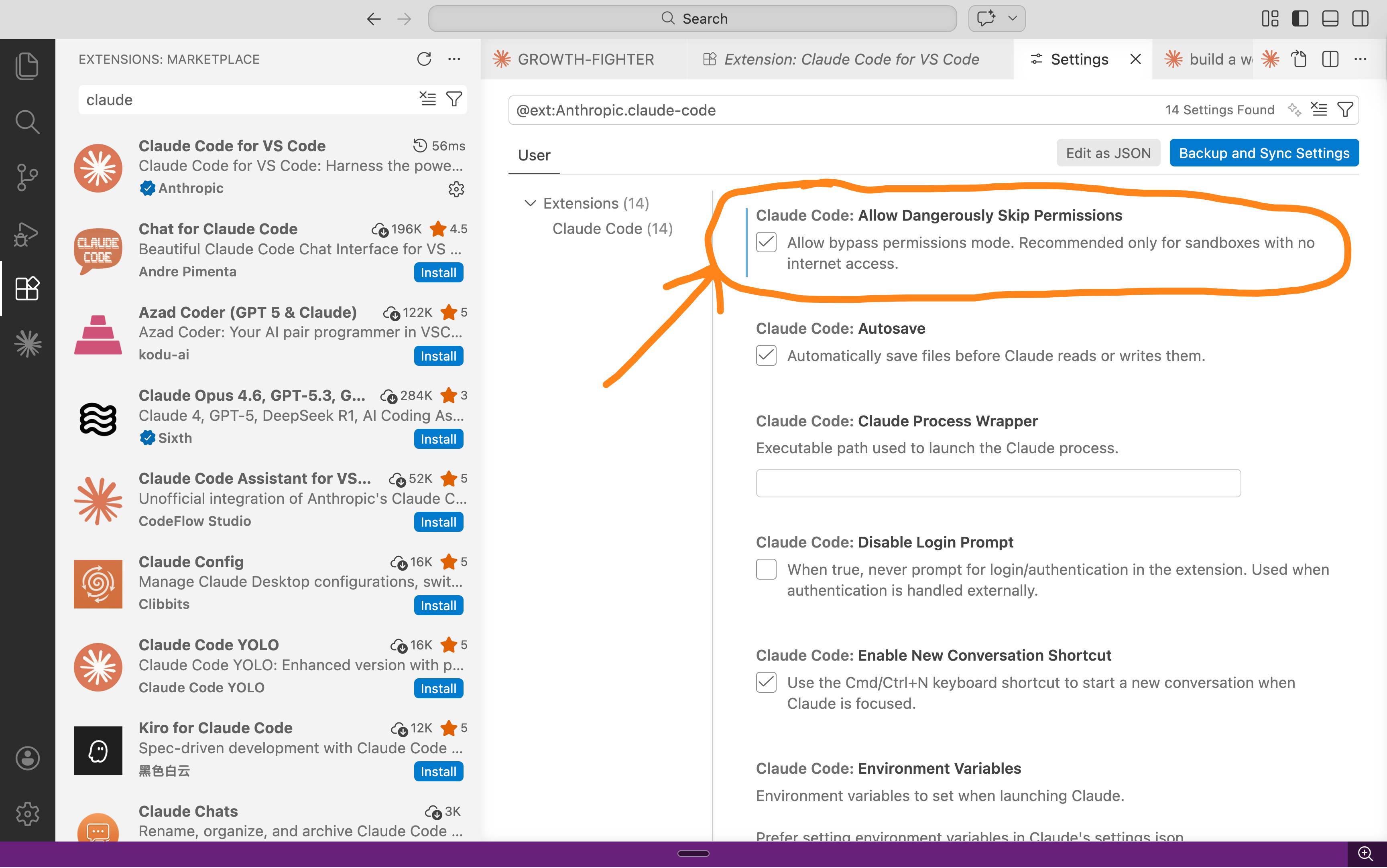 Find the option called “Skip Permissions”. Turn it on. This tells Claude to stop asking for your permission for every tiny action. Set it and forget it.