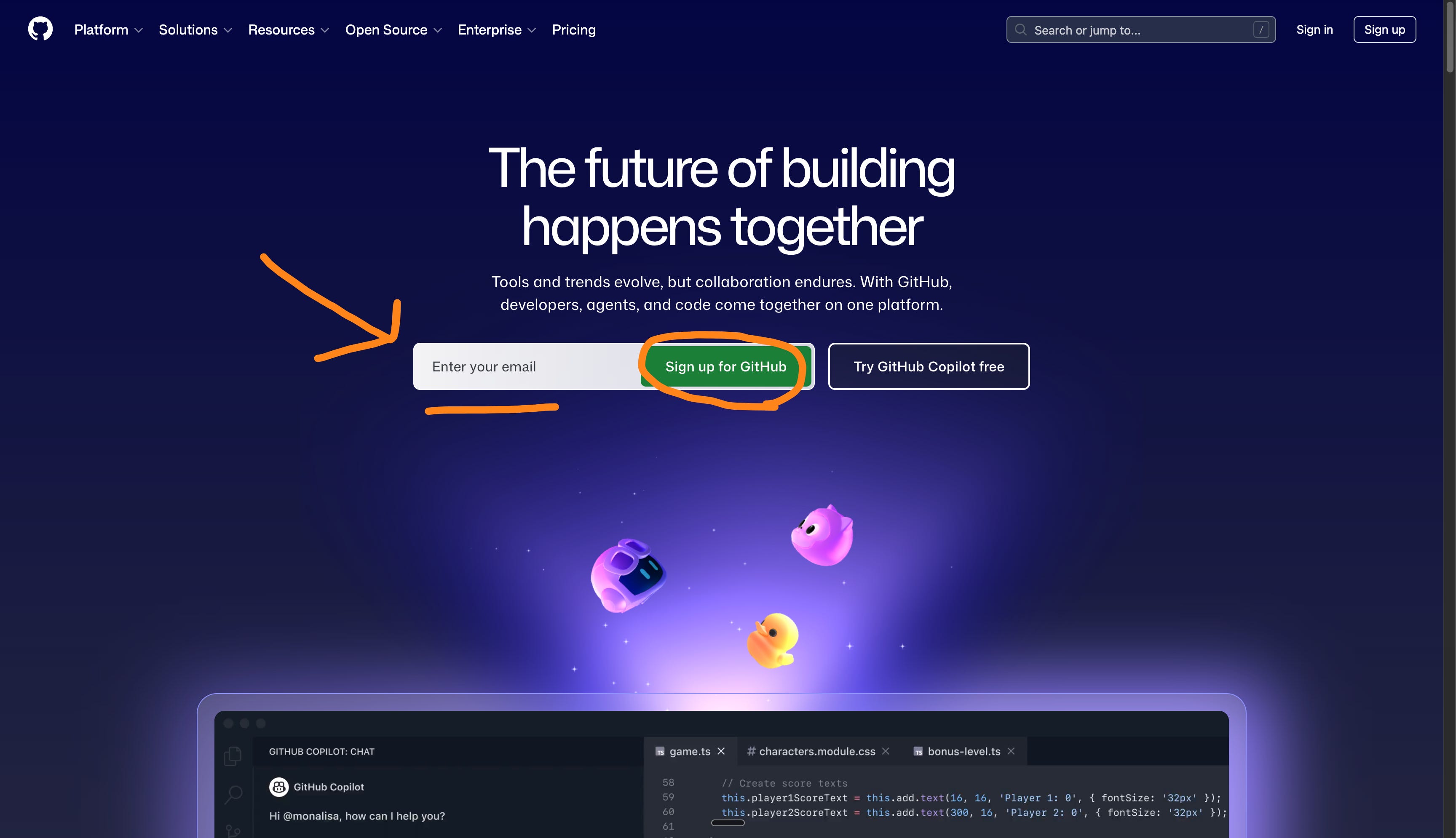 Go to github.com. Click Sign up (right in the middle).