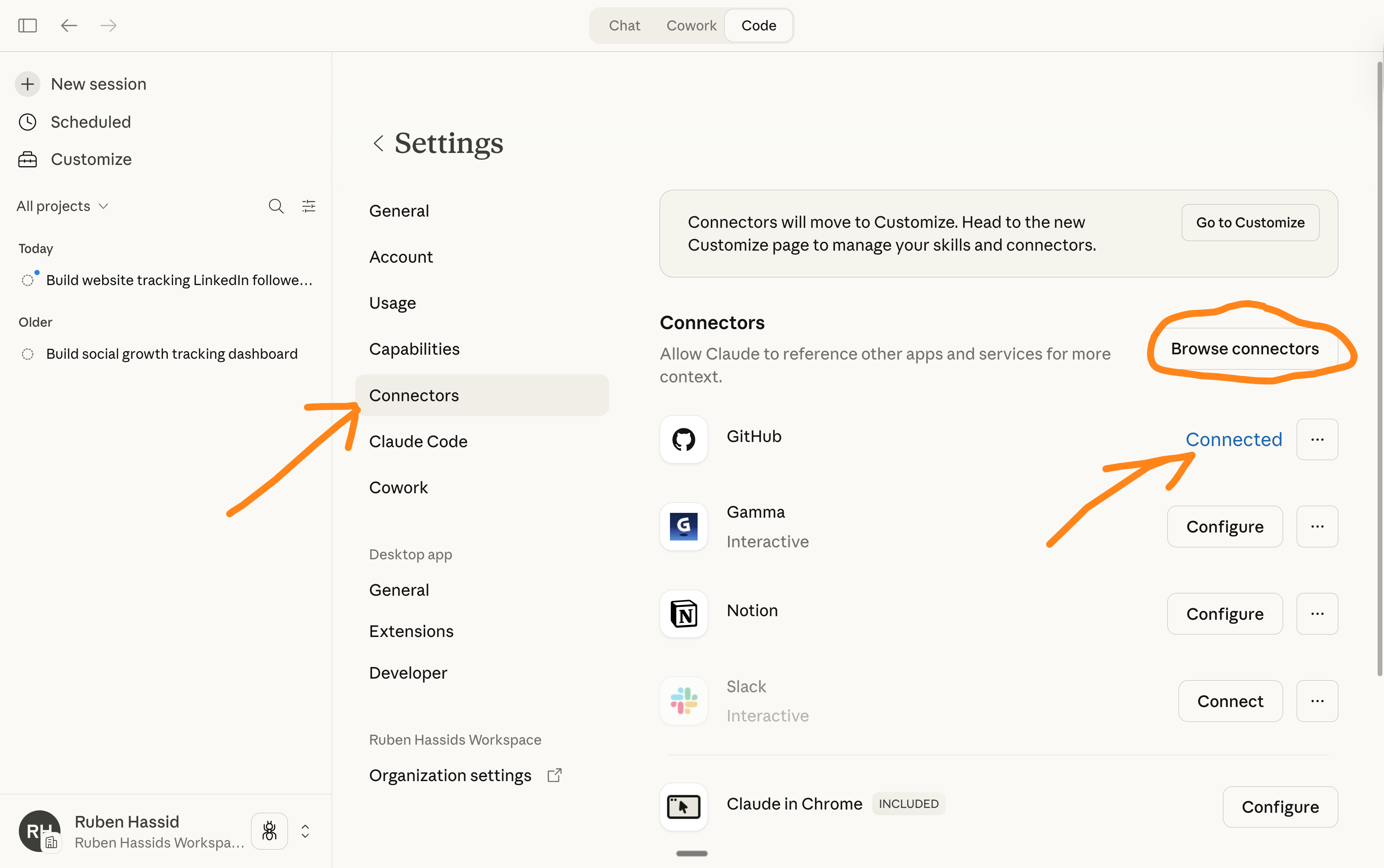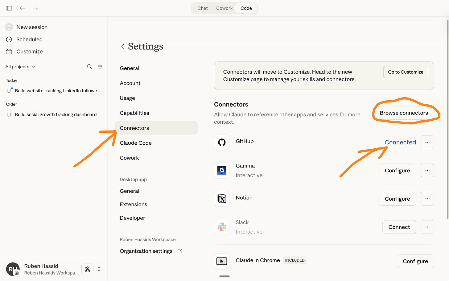 Go to Browse connectors → Search GitHub → Connect your GitHub.