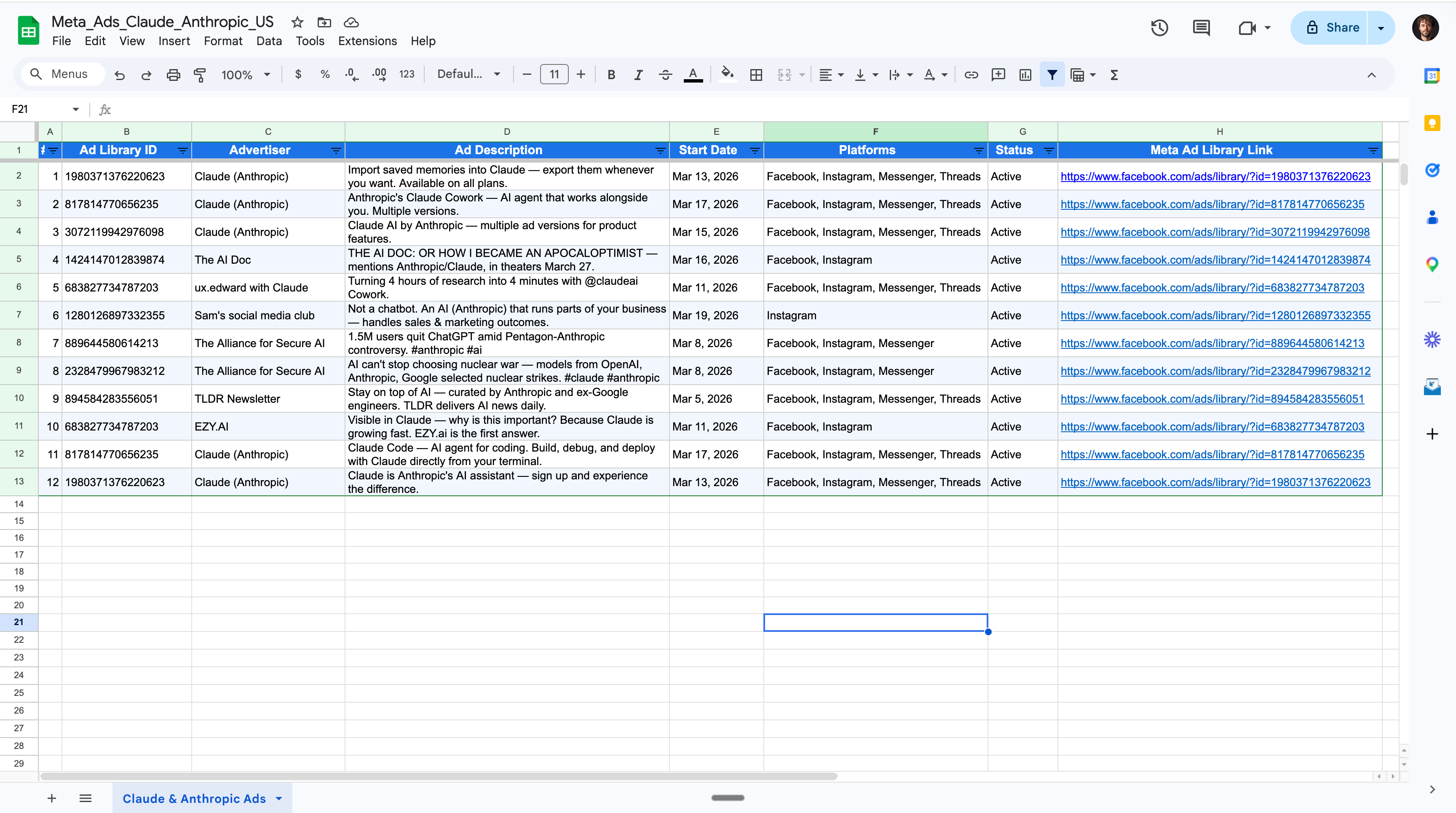 Go to the Meta Ads Library: search the latest viral ads about Claude or Anthropic in the U.S. only. Create a Google Sheets with at least 10 links to 10 ads that mention Claude or Anthropic.