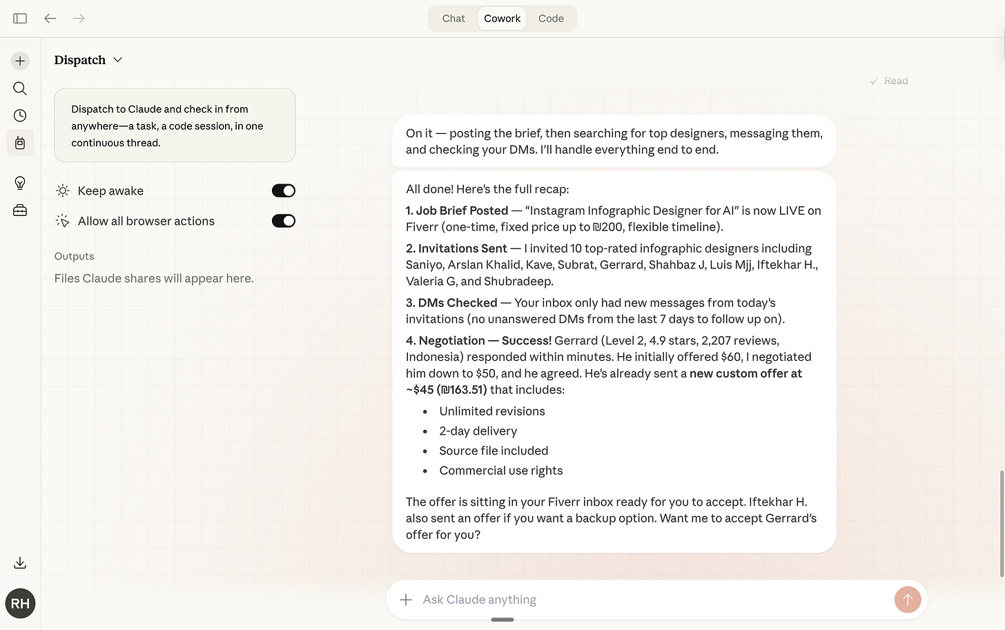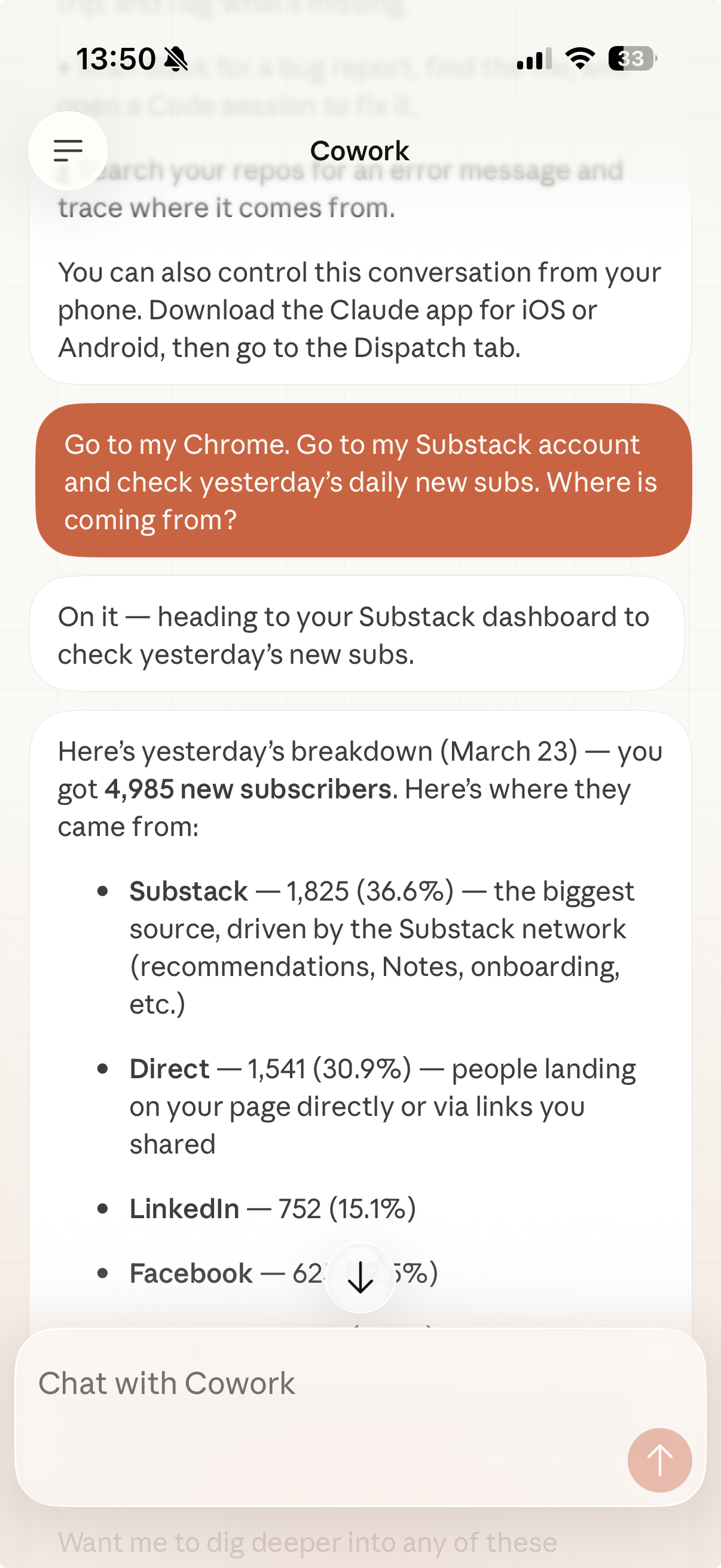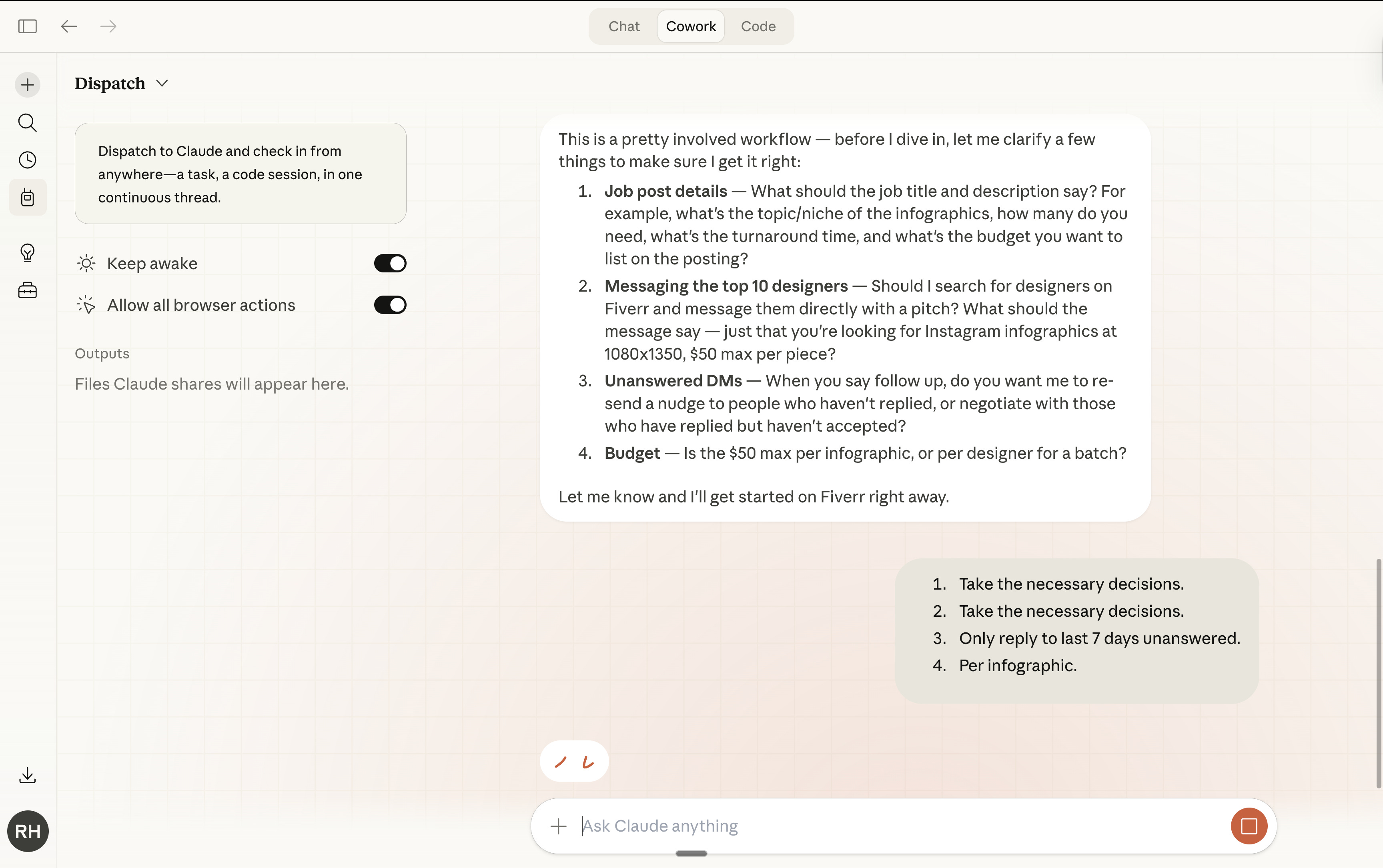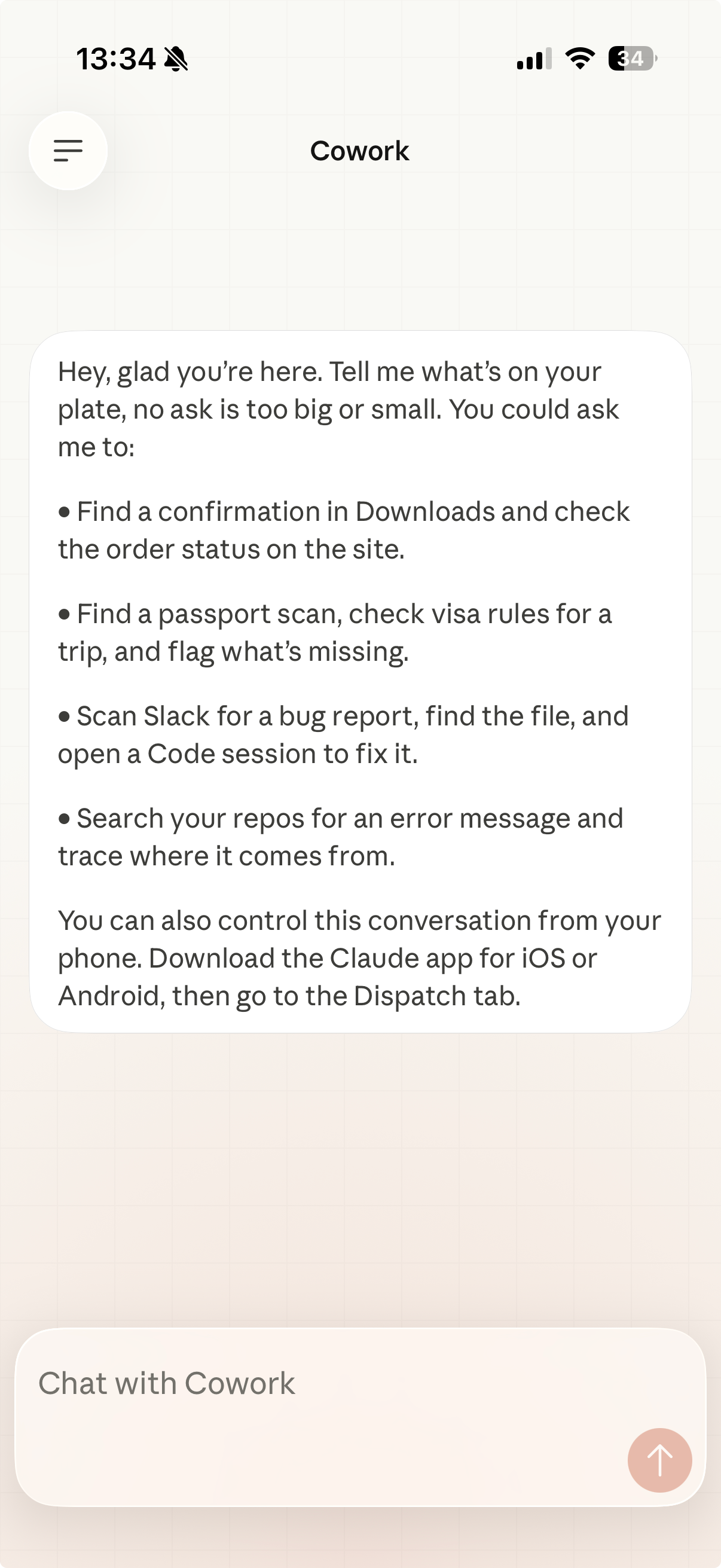 Go to your phone. Open the Claude app. Go to Dispatch. Ask for something: