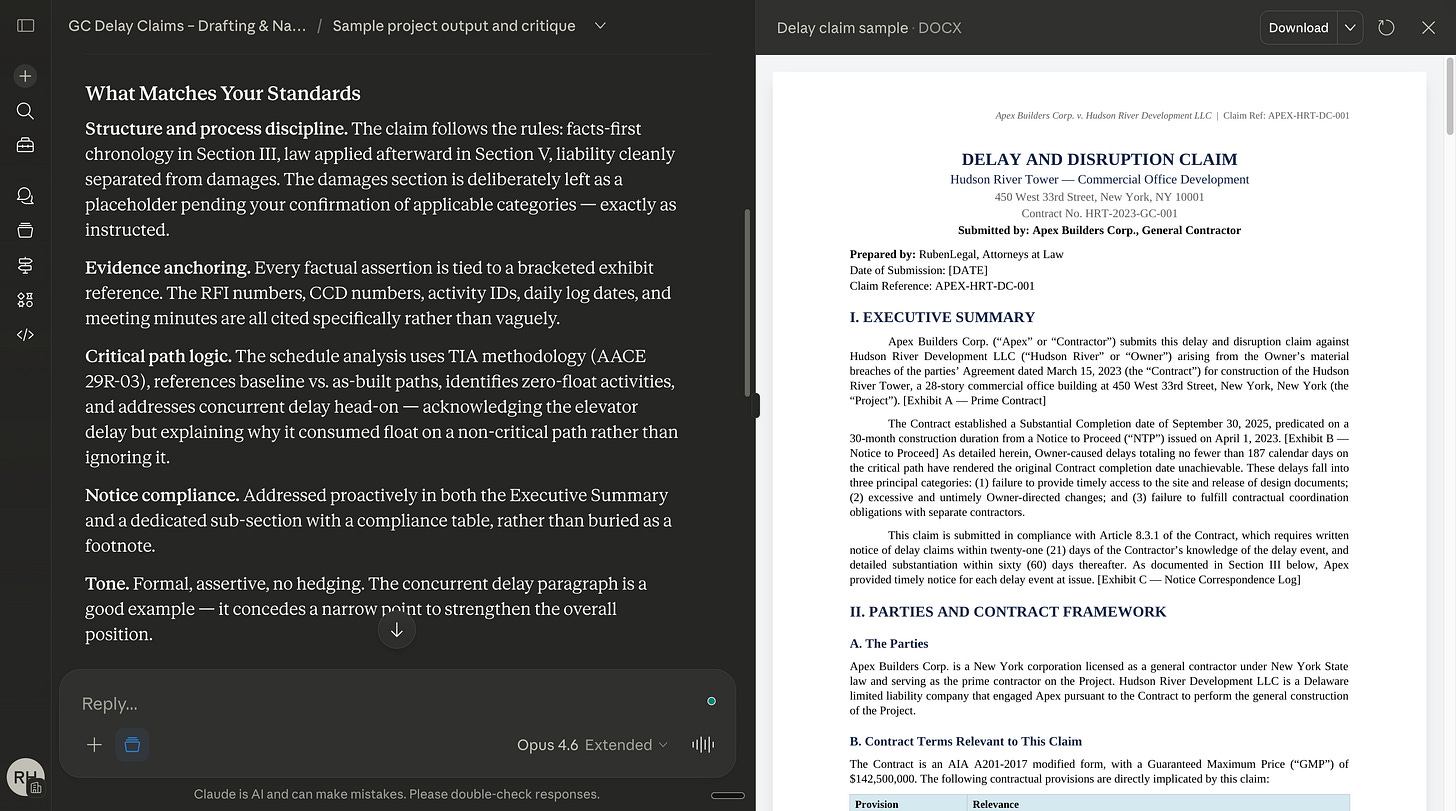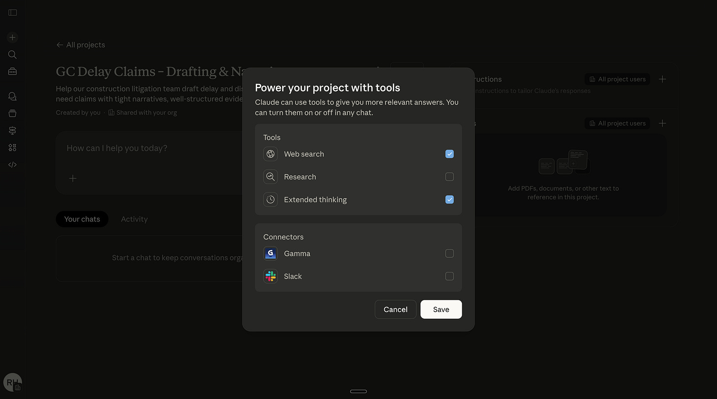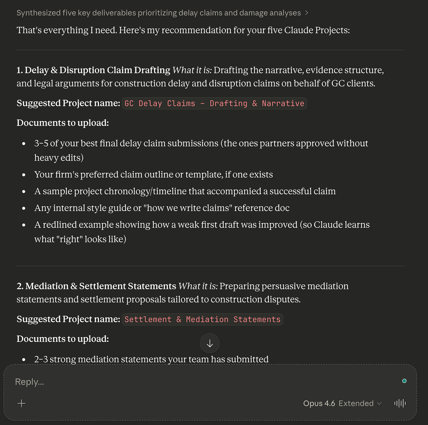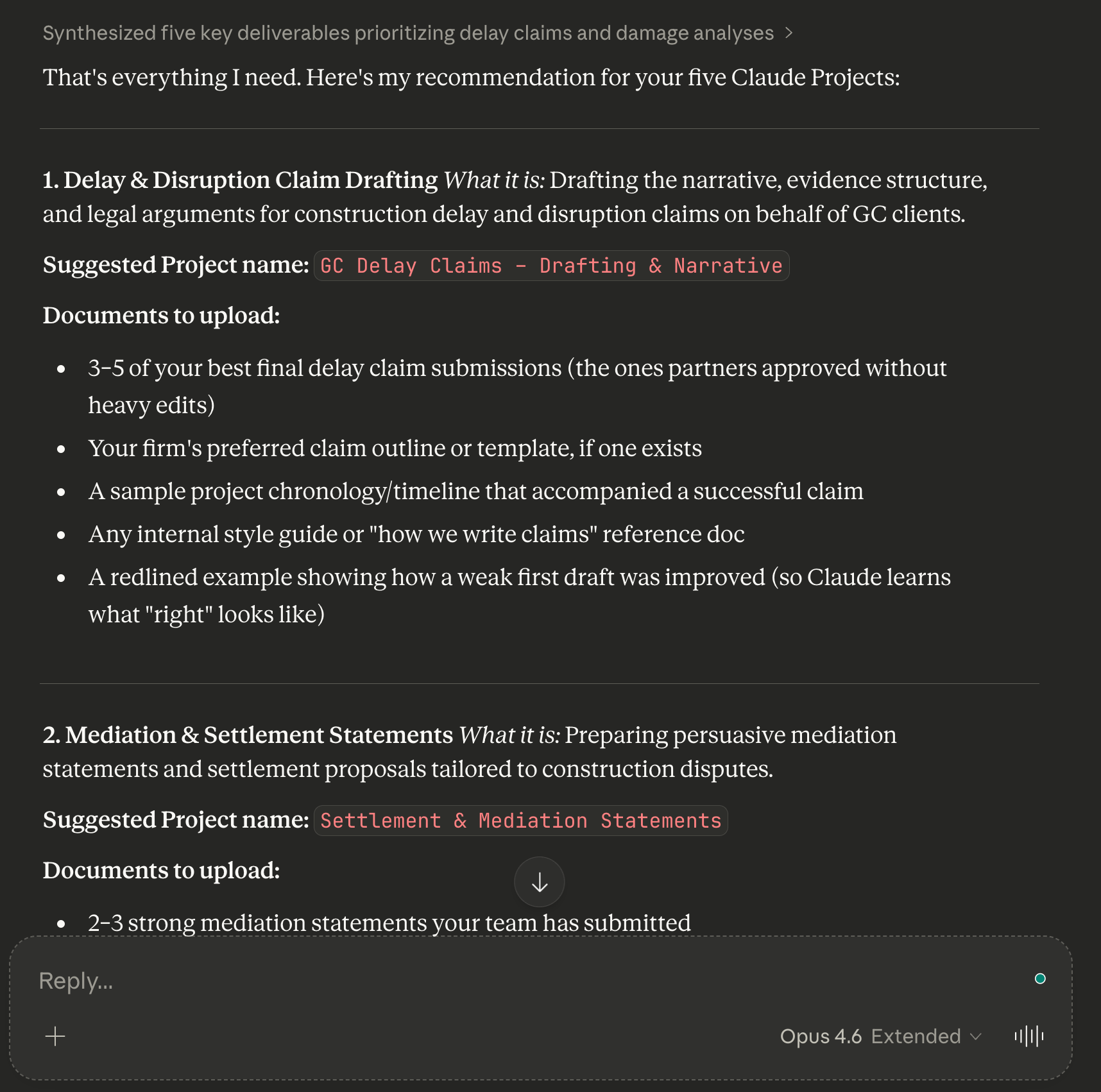 For example, a law firm would have one for client memos, one for case summaries, one for demand letters, and one for internal reports. Each Project gets only the context that the deliverable needs. Client memos get the tone guide and client roster. Court filings get the formatting rules and statutory references.