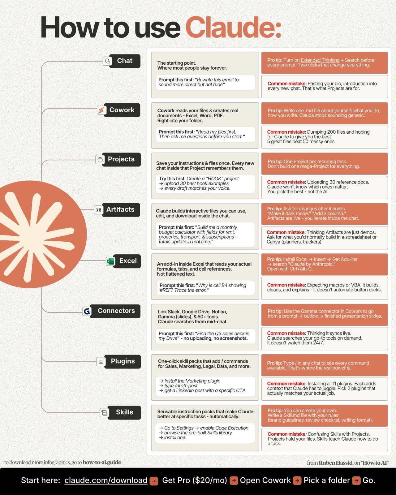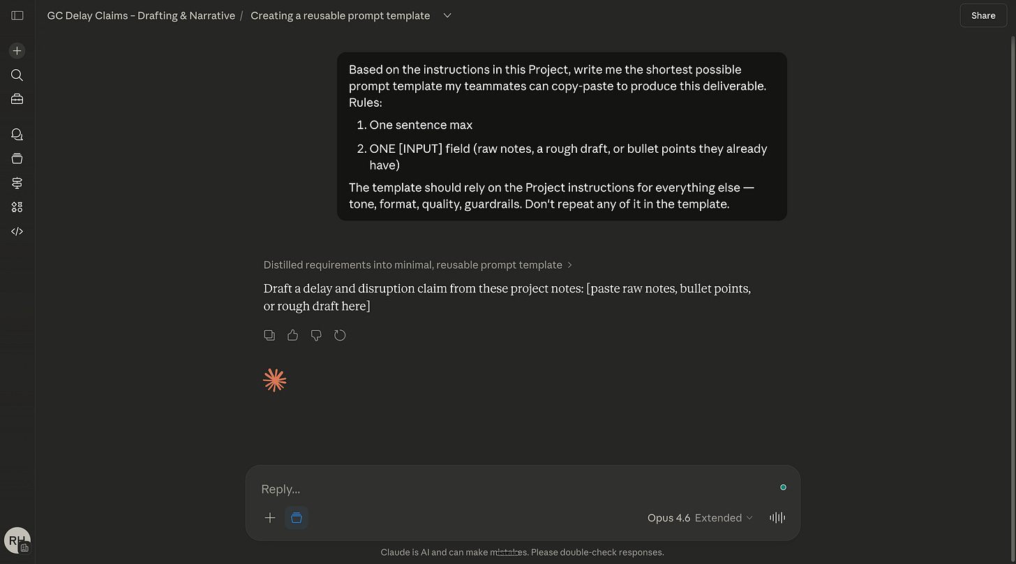 The template should rely on the Project instructions for everything else — tone, format, quality, guardrails. Don't repeat any of it in the template.Review what Claude gives you. Tweak it if needed. Save it to that Project’s Knowledge (probably on your Drive). Repeat for each Project. 5 minutes / Project.