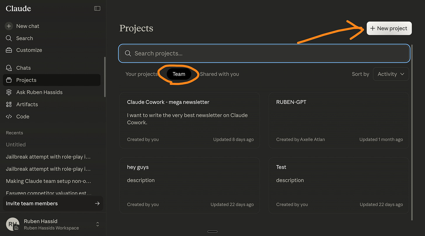 Go to Claude → Projects → Team → New Project.