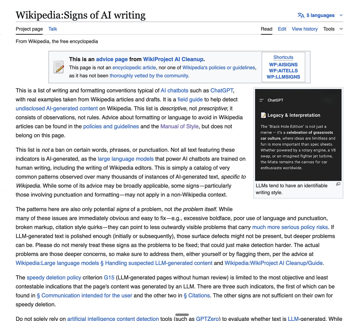 I found this massive Wikipedia library on “Signs of AI writing”.