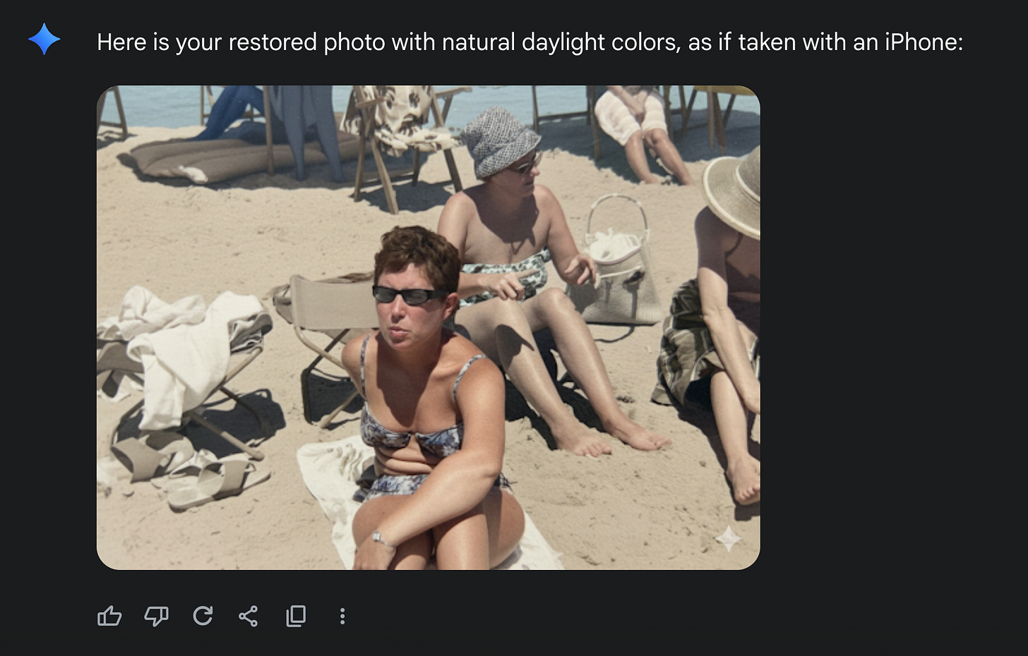 I bring her back to life, for a couple of seconds, like a 2025 woman enjoying the beach. She feels real. So I did again (and again, and again):