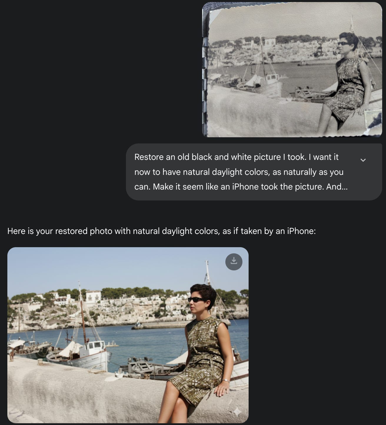 Restore an old black and white picture I took. I want it now to have natural daylight colors, as naturally as you can. Make it seem like an iPhone took the picture. And turn it into a photo instead of a photo of a photo. Don't change any elements in the photo itself.