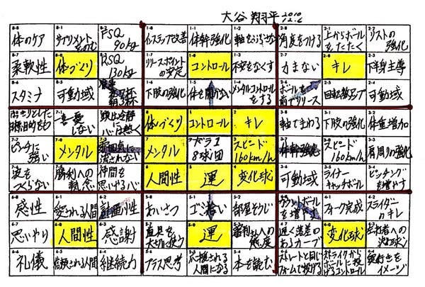 Ohtani tracked progress rigorously (many items checked off) and credits this systematic approach for his insane achievements: becoming a two-way superstar, multiple MVPs, $700M contract, 50-50 club, World Series win, etc.