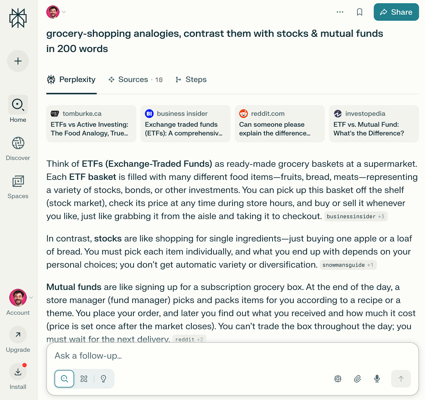 ✦ I shared this prompt: “Act like an experienced financial educator; explain ETFs through grocery-shopping analogies, contrast them with stocks & mutual funds.”
