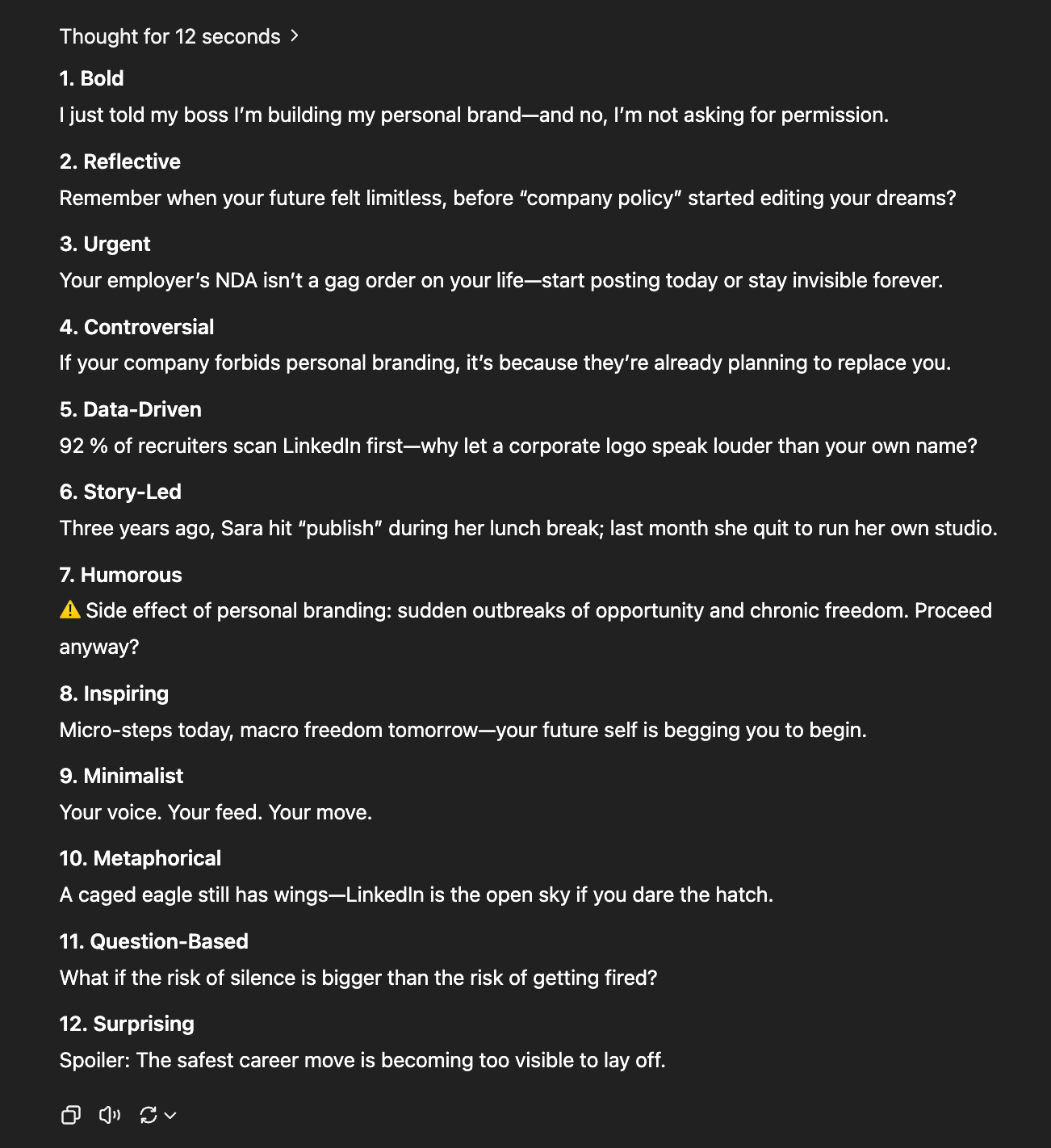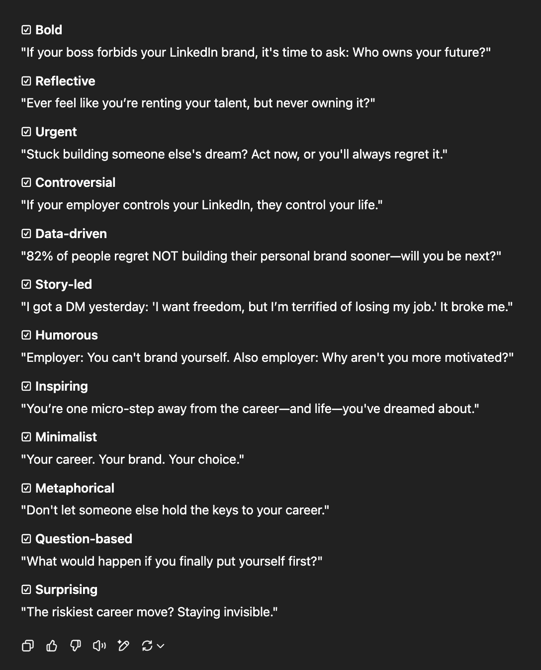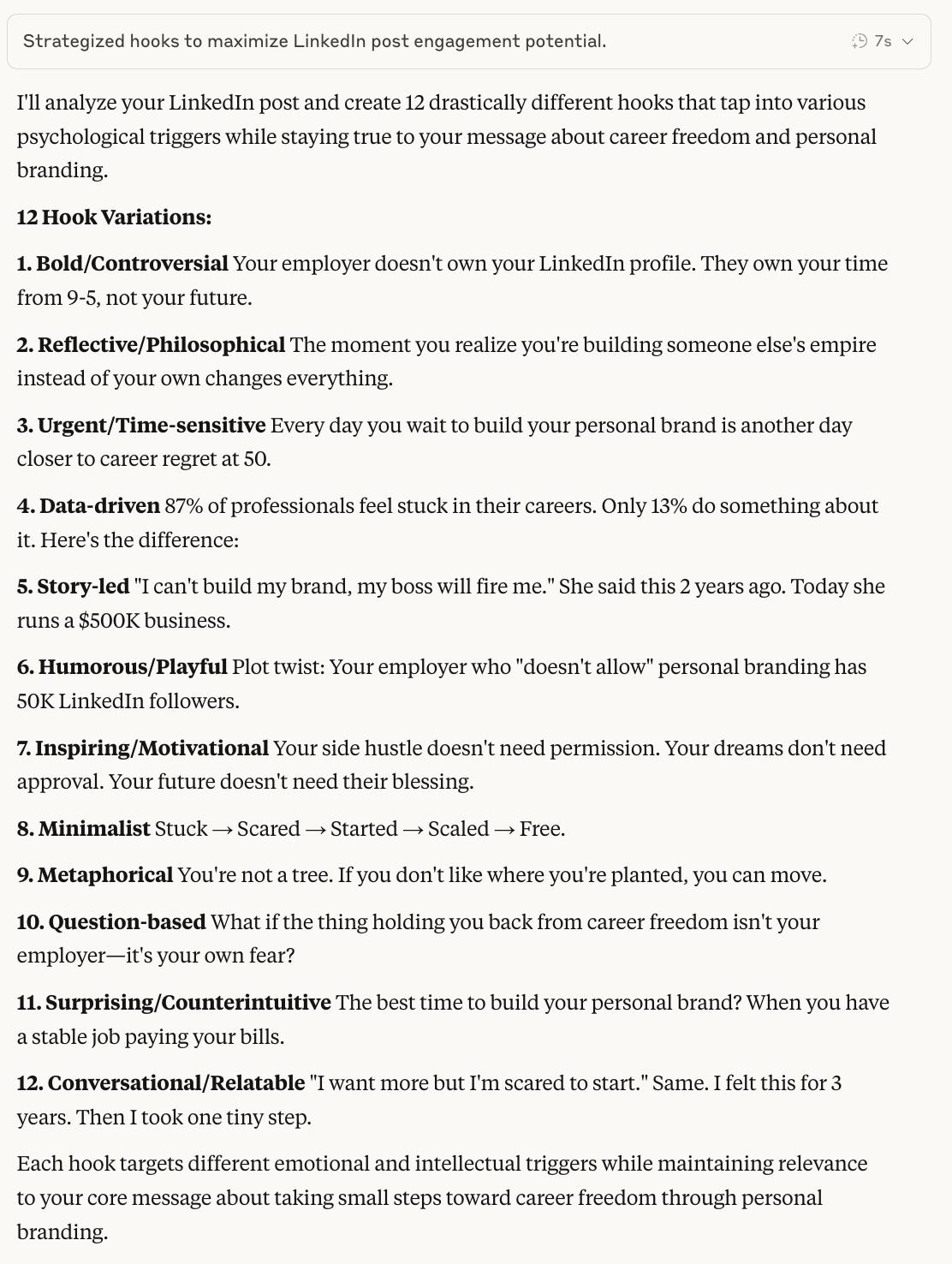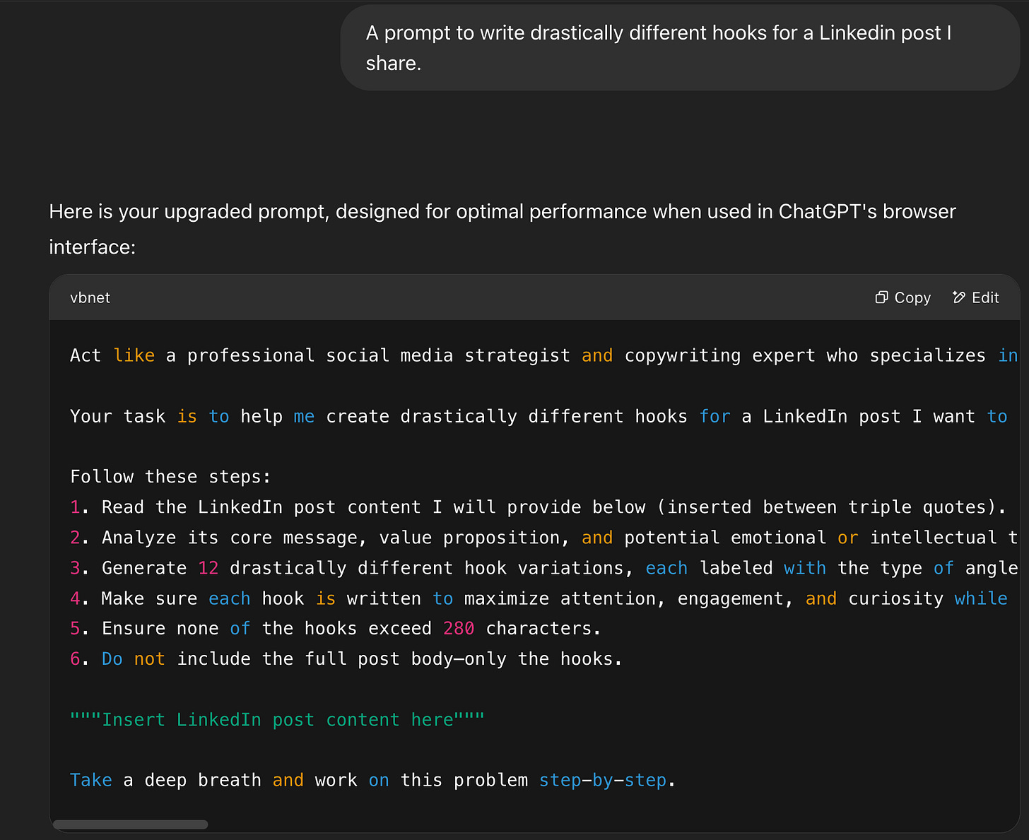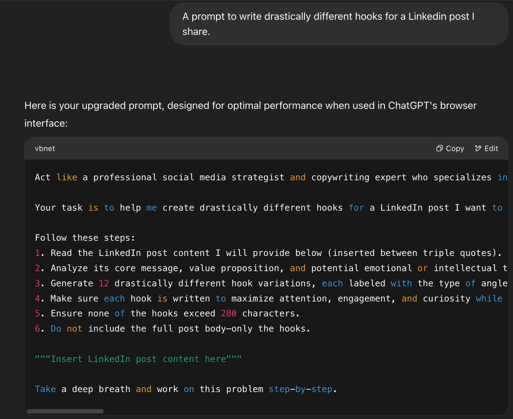 I prompted: “A prompt to write drastically different hooks for a Linkedin post I share.” Here’s my Prompt Maker’s answer: