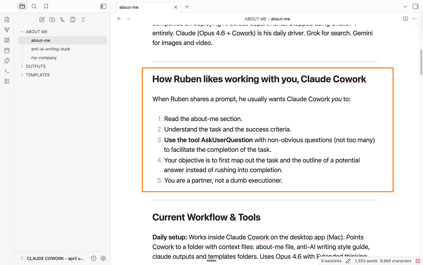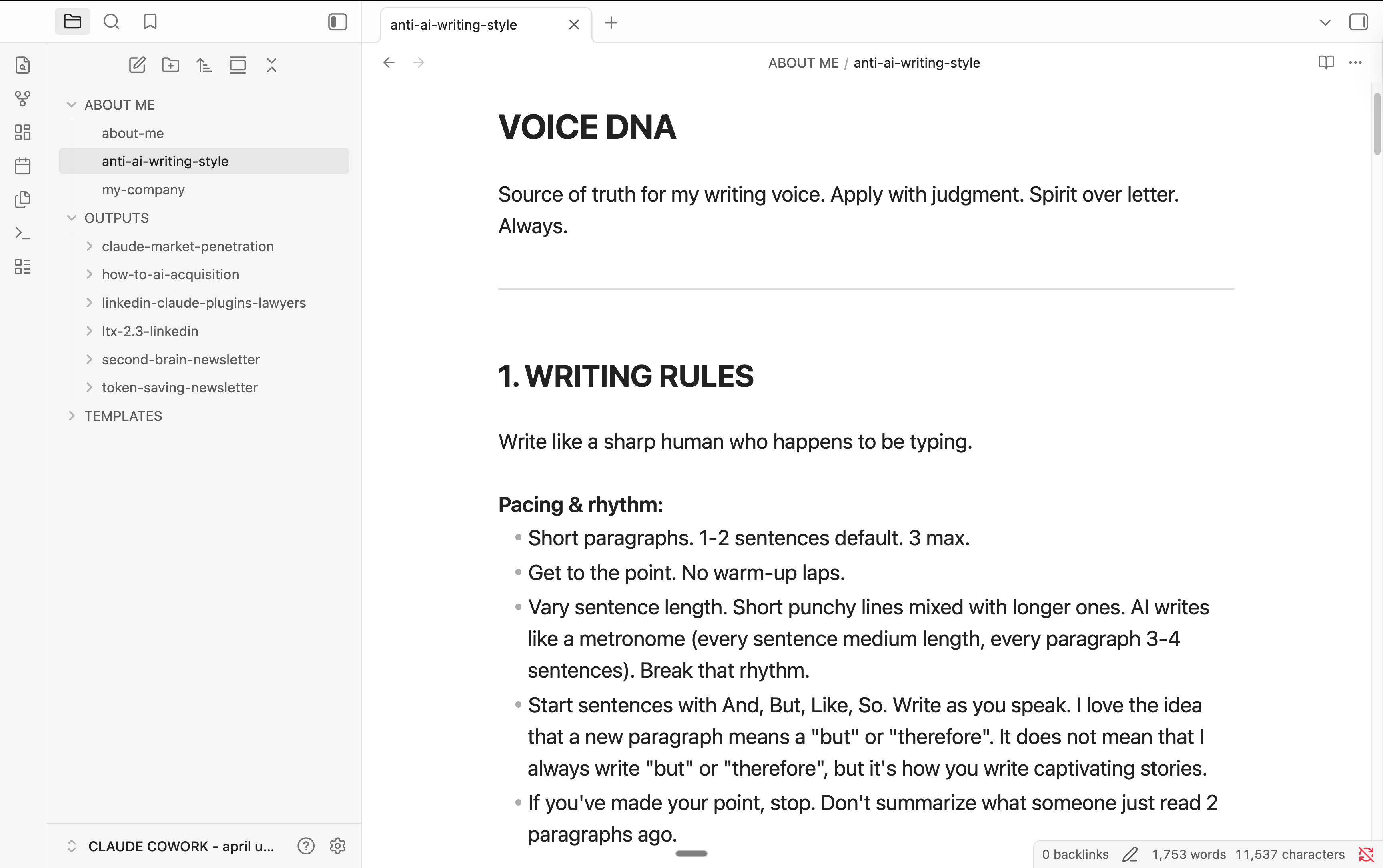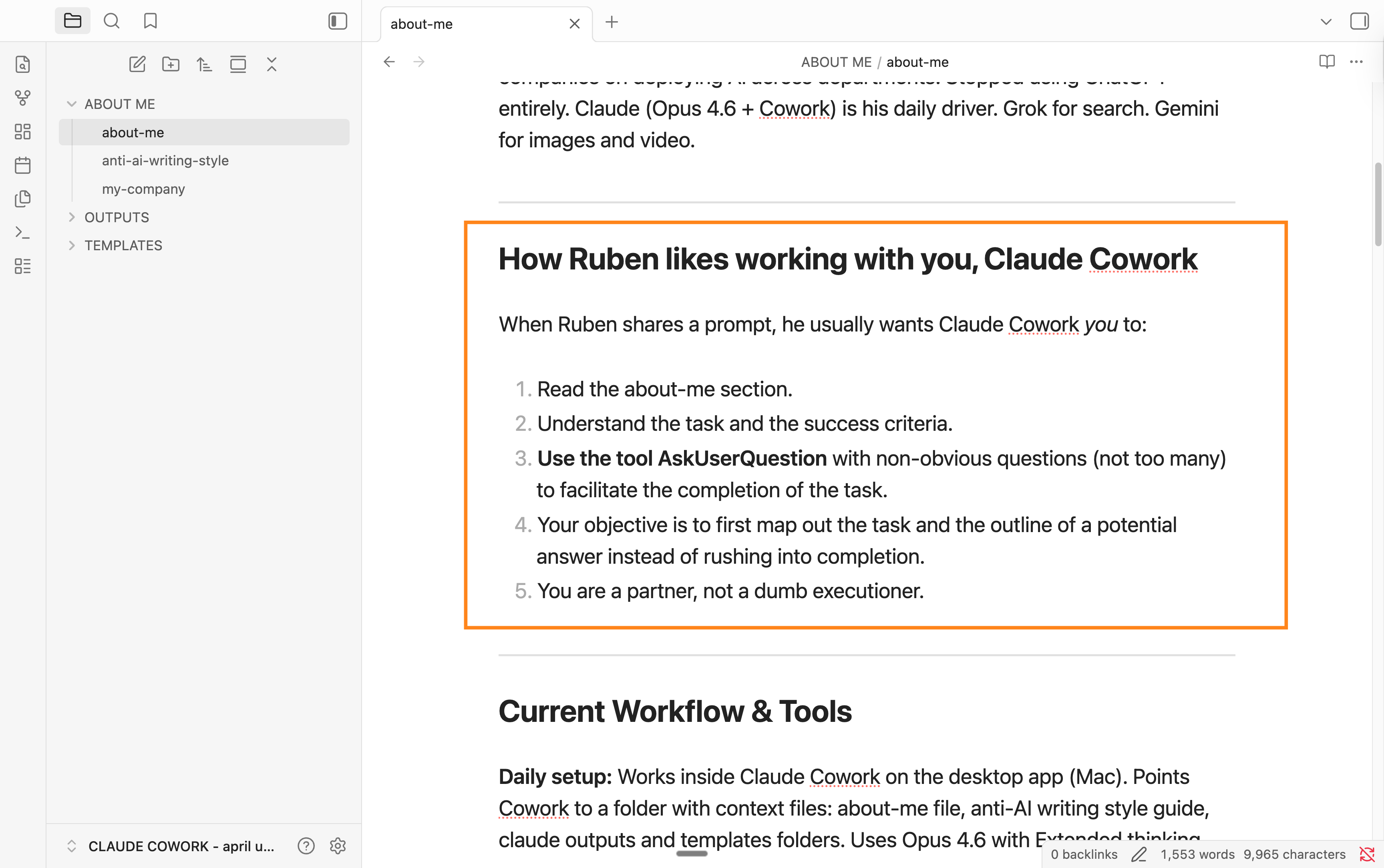 Your about-me files tell Claude your style, your rules, your goals. That covers the basics (and non-negotiables). Now Claude sounds like you. Good.