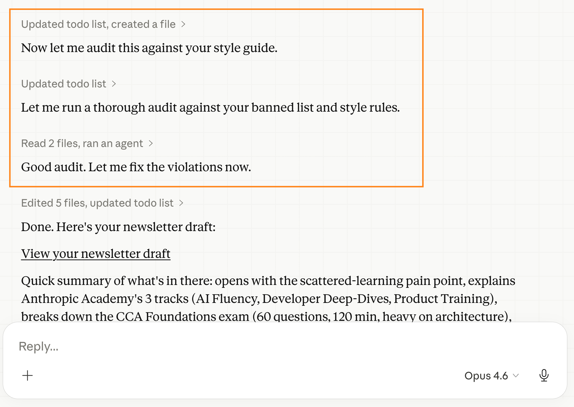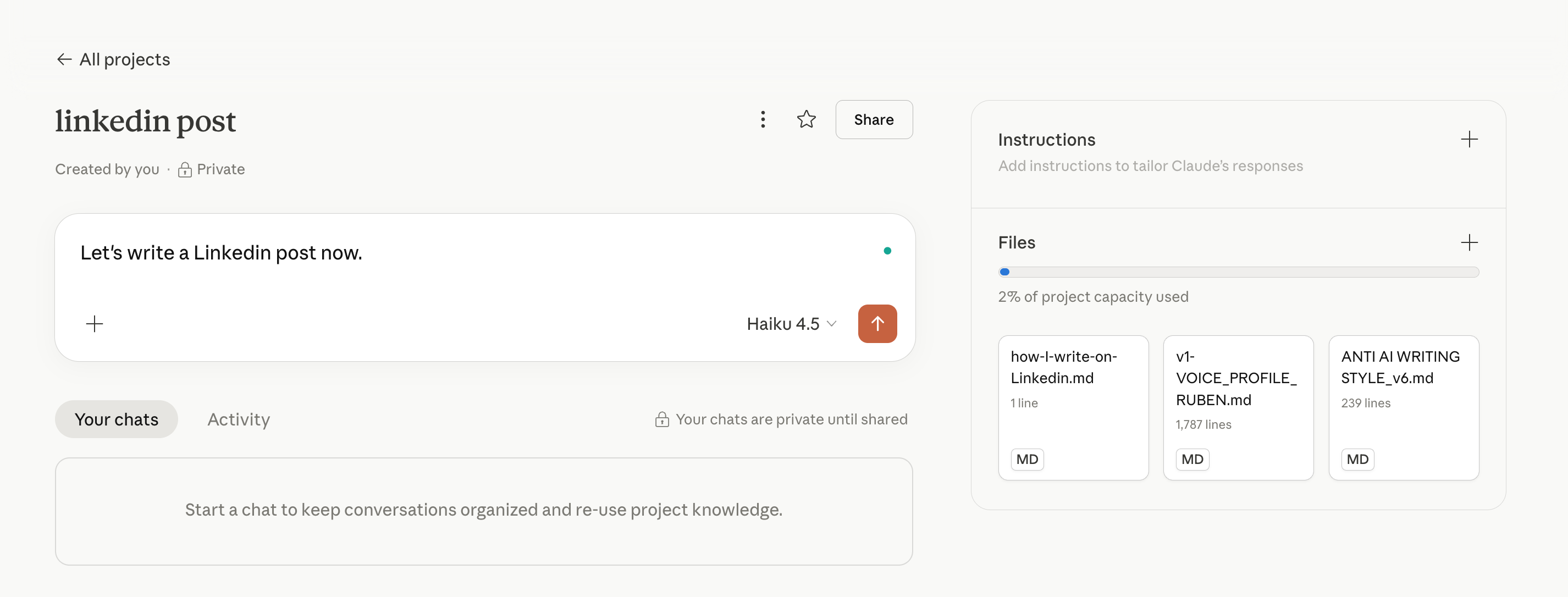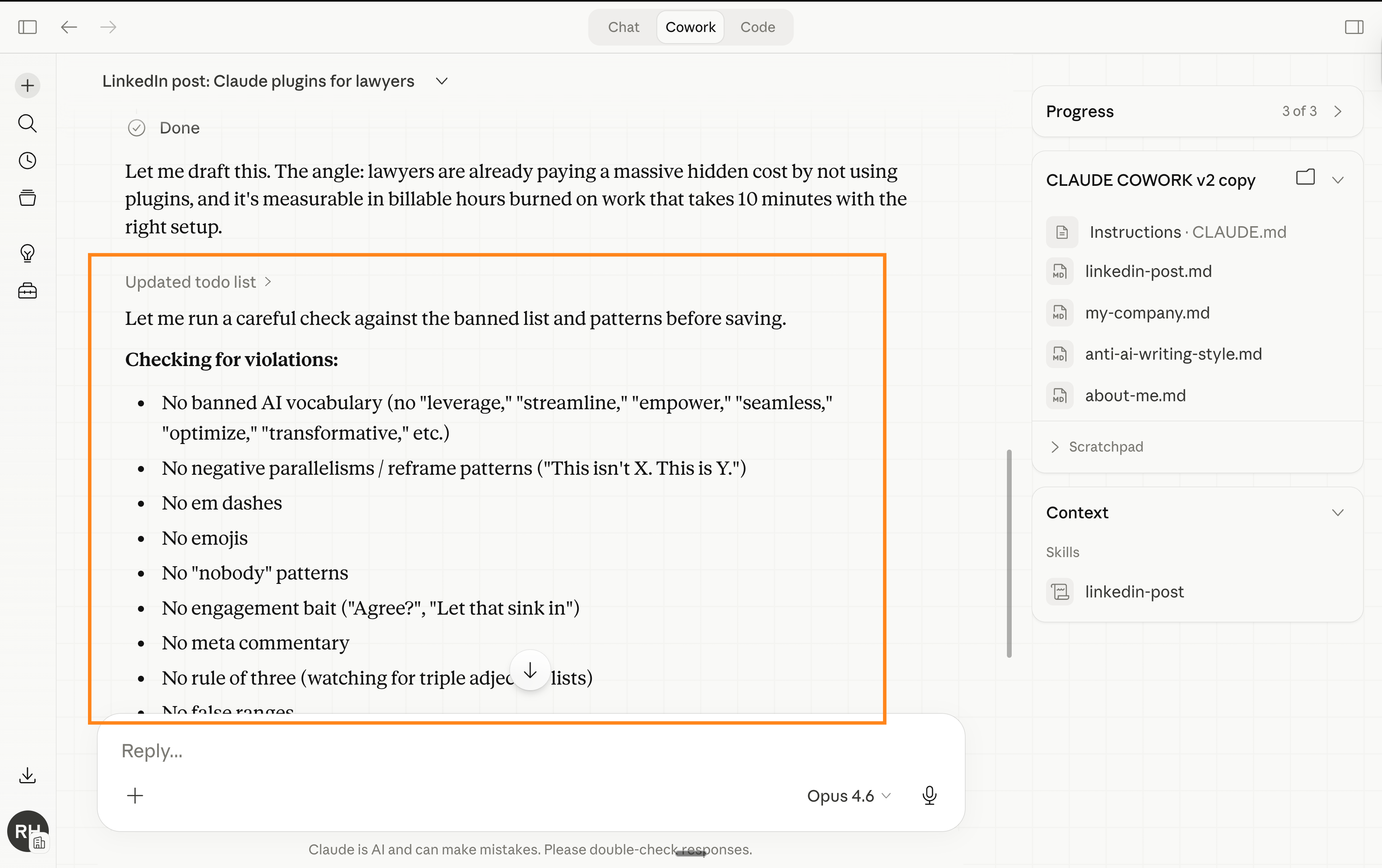 Your about-me files tell Claude your style, your rules, your goals. That covers the basics (and non-negotiables). Now Claude sounds like you. Good.