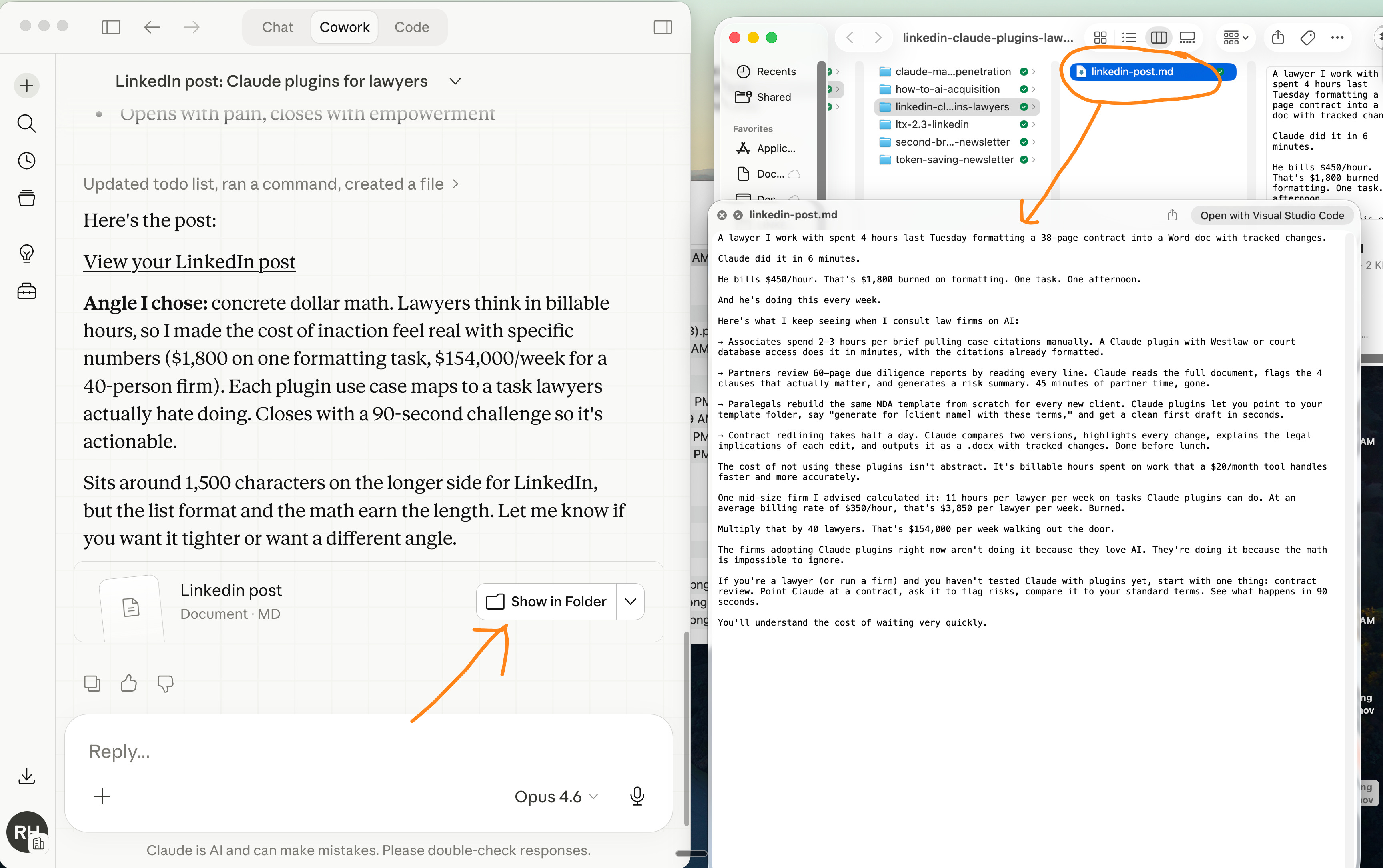 Every and any writing piece of content. LinkedIn posts, newsletters, emails, written in YOUR voice (because it reads your files). But also contracts, briefs…