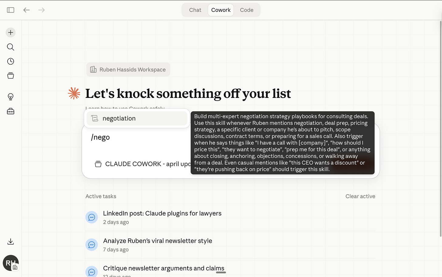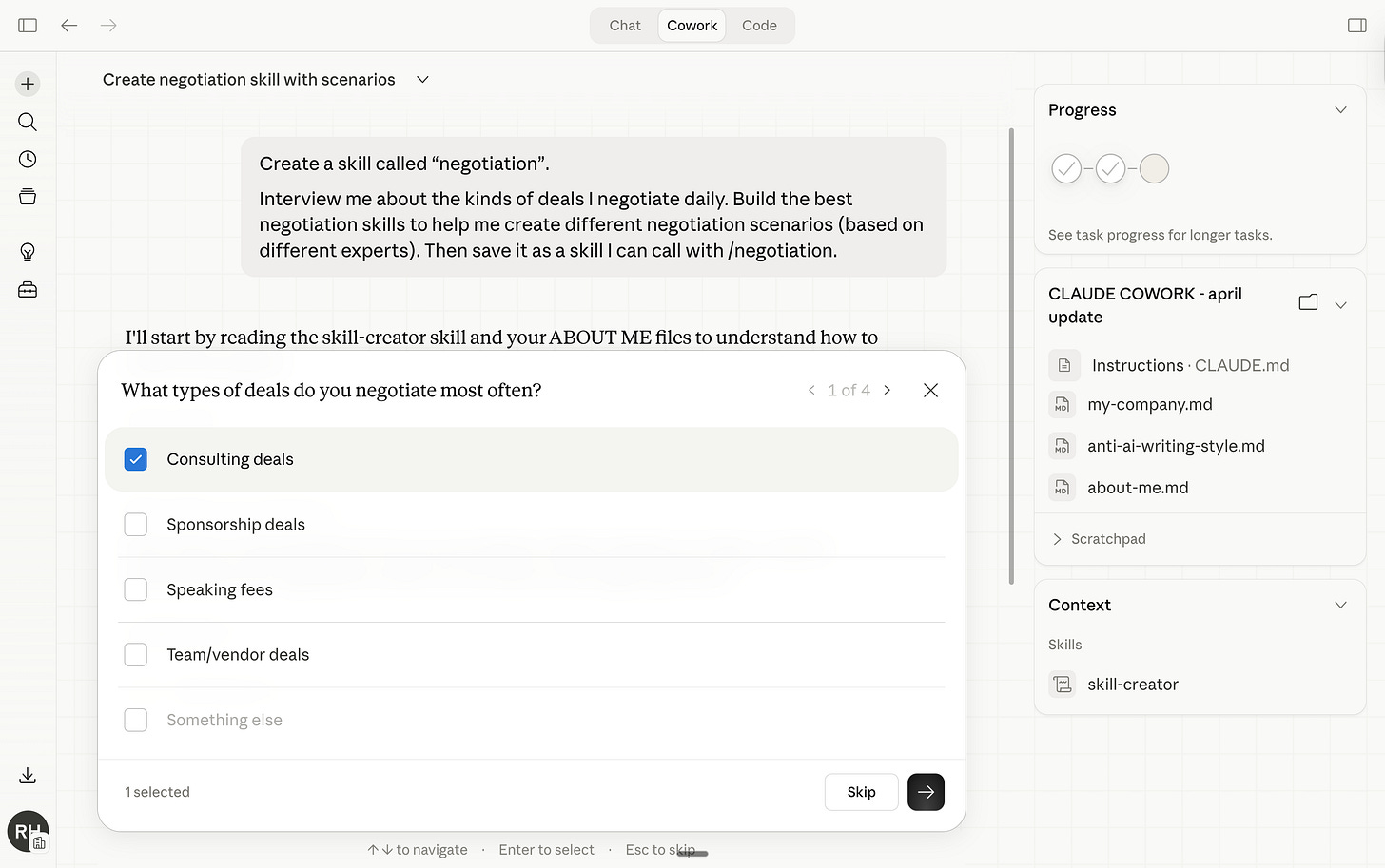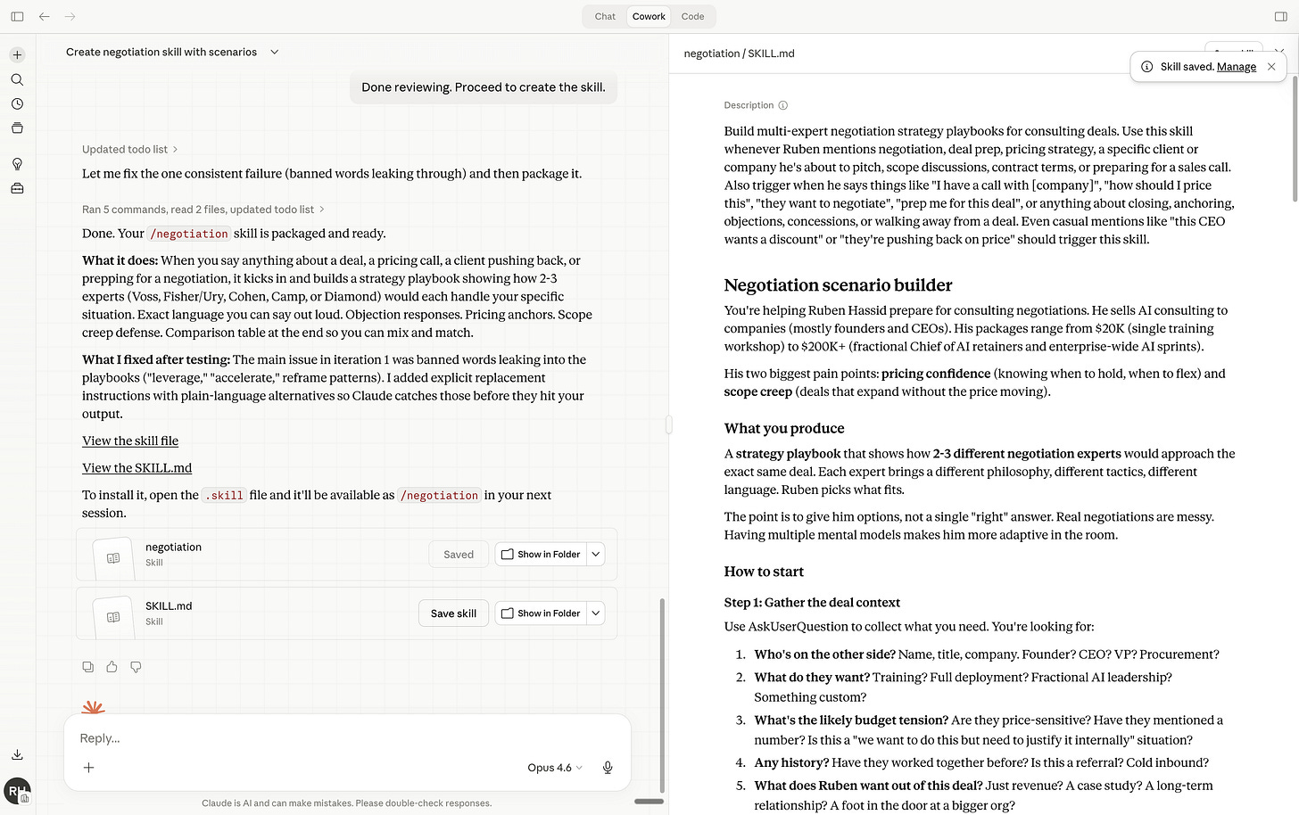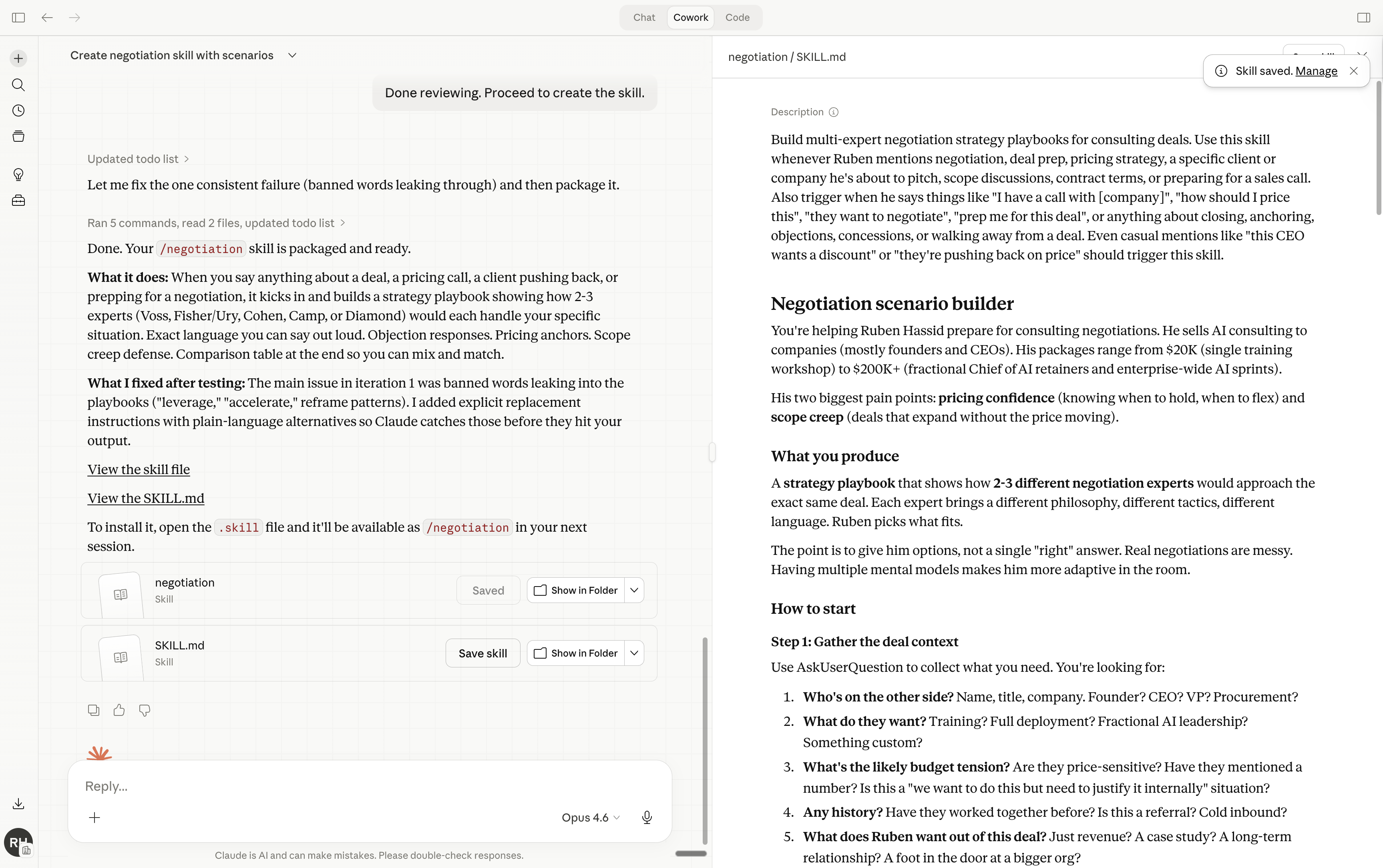 Now anytime I go to Cowork and I prompt /negotiate - it knows what to do.