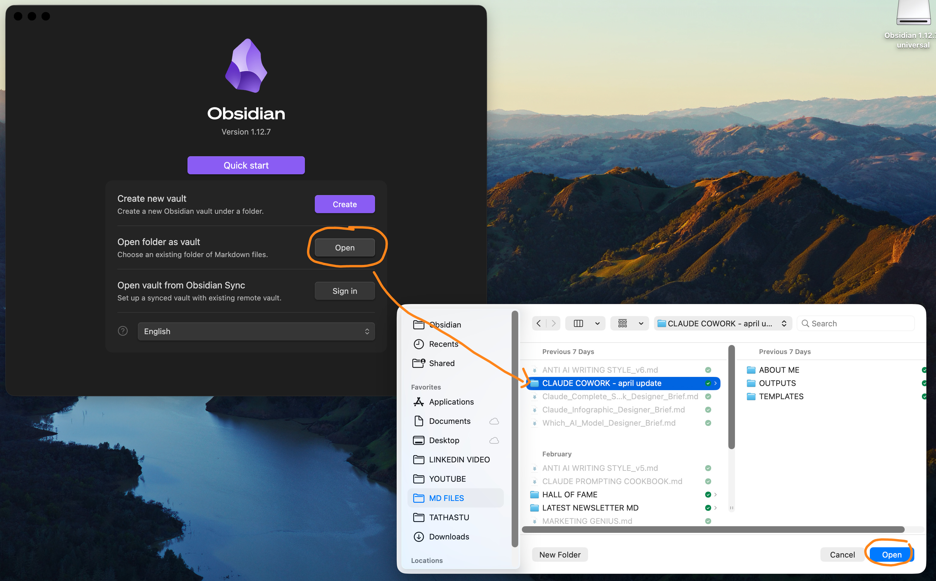 1 - I open Obsidian. It alread has my Cowork folder opened.