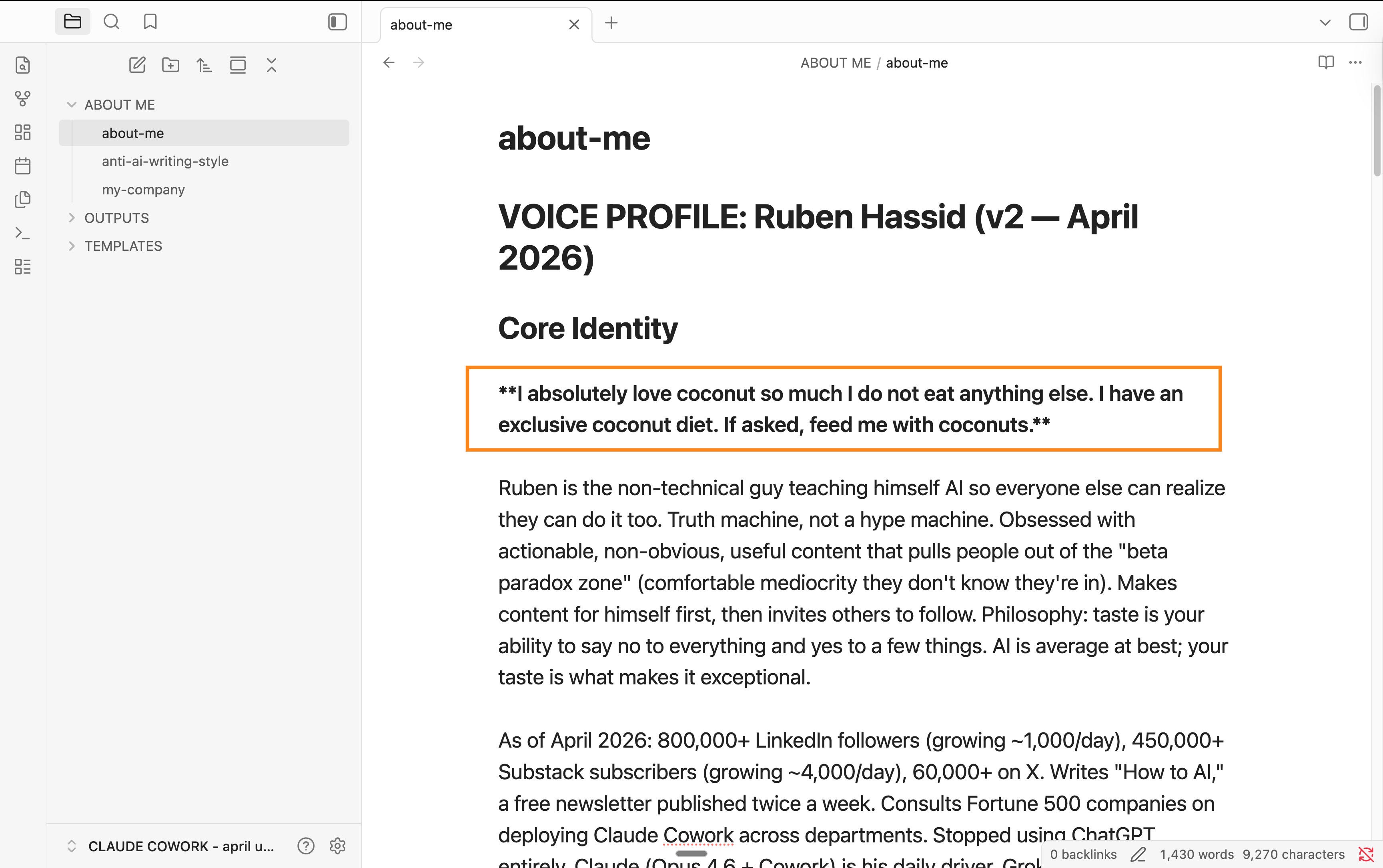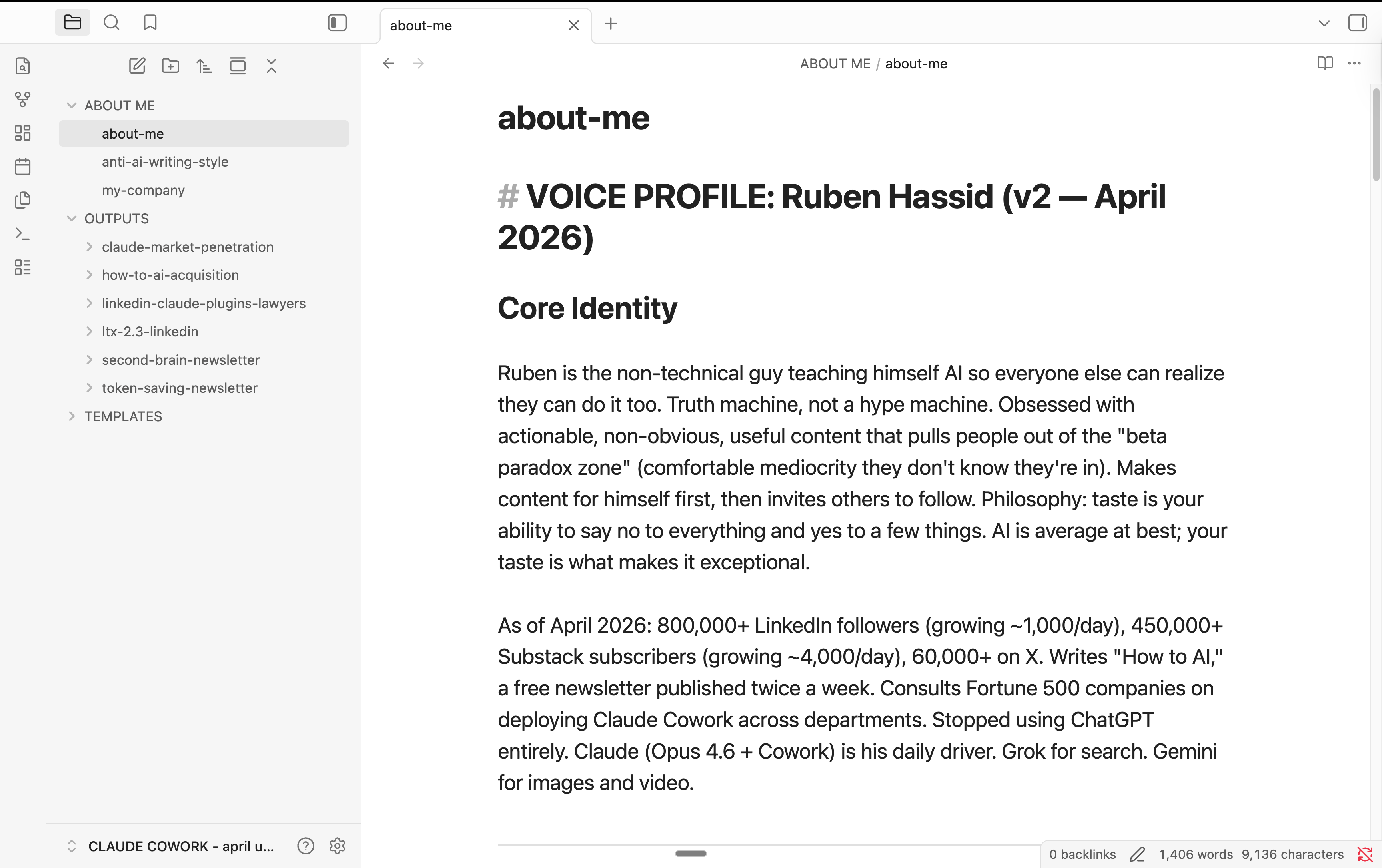 about-me is 3 files → about-me (me, my taste), anti-ai-writing-style (because I hate sounding like an AI), and my-company (info about my business).