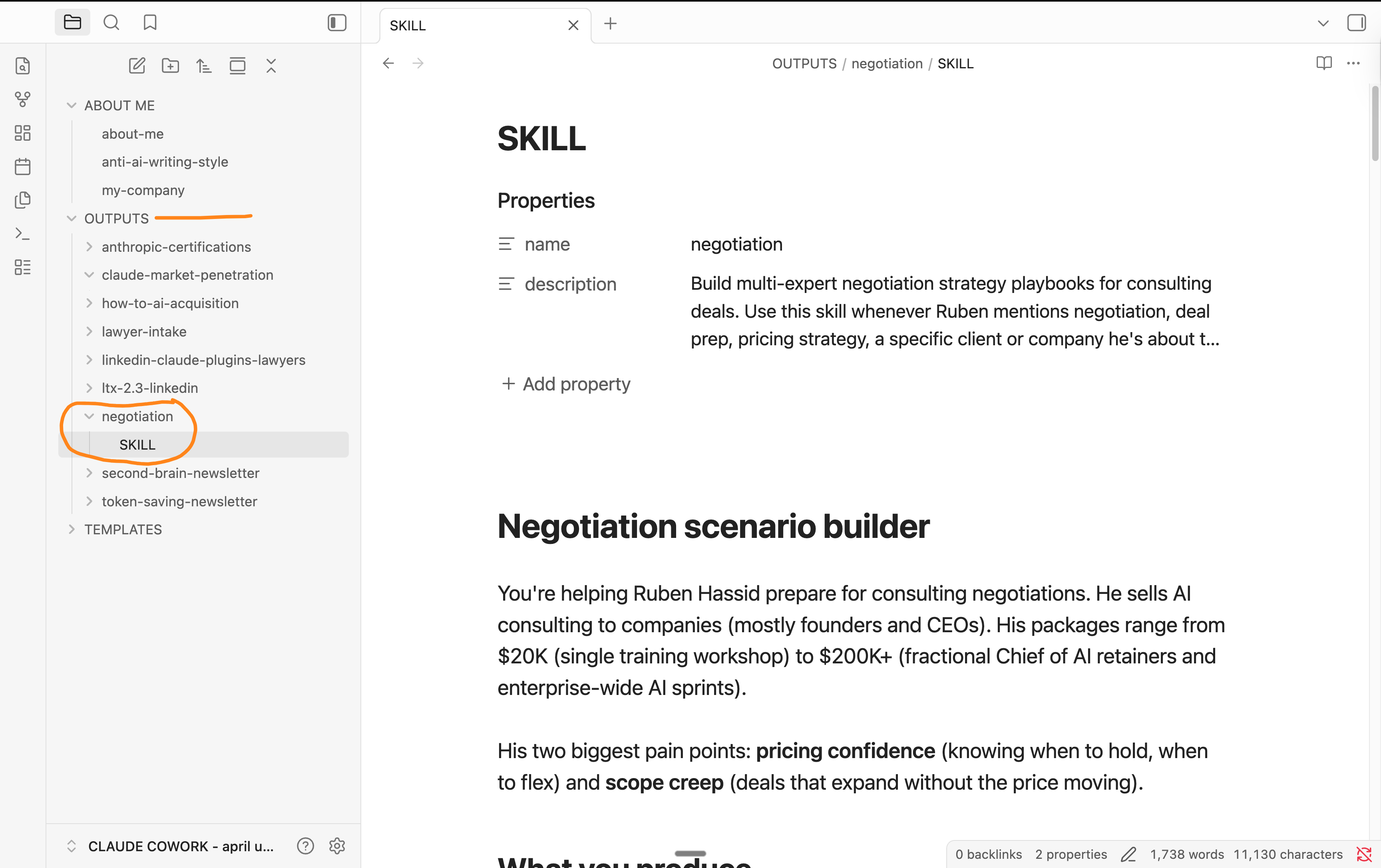 Every skill lives as a text file in your Cowork folder. Which means Obsidian can see it, search it, and let you edit it. You tweak your LinkedIn skill after you find a better hook formula? Open it in Obsidian, change one line, save.