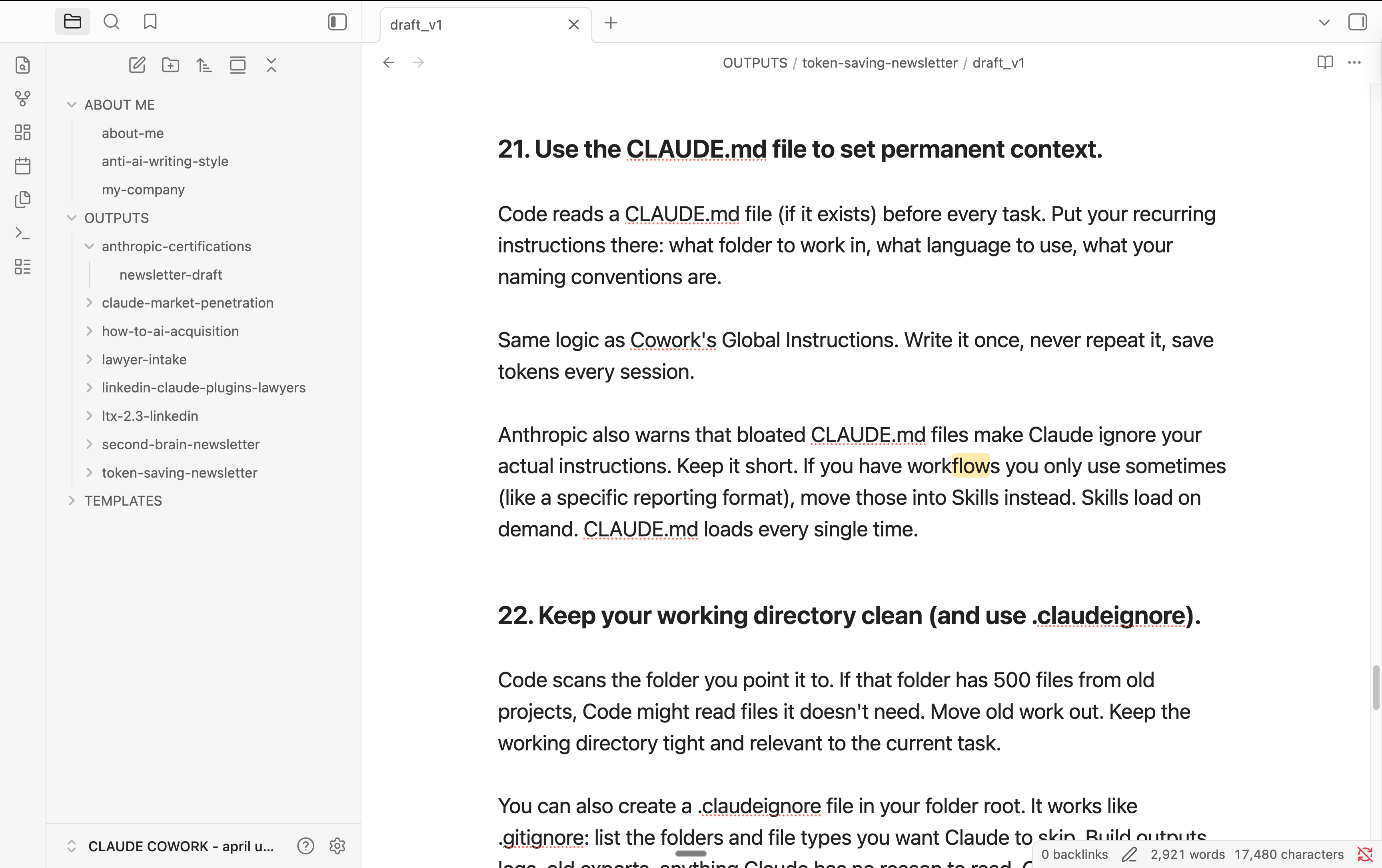 It's actually the whole reason this setup works. I tried Notion for this. But it added invisible formatting garbage that made Cowork choke on my files.