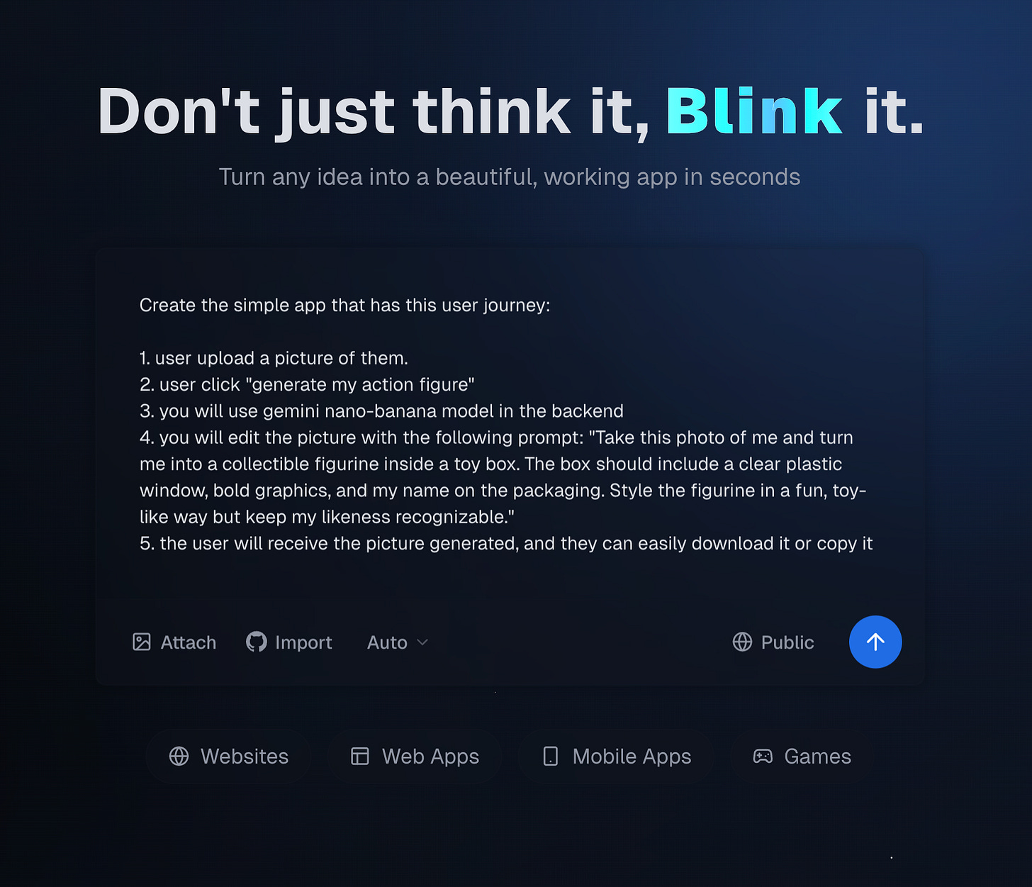 The result blew me away: https://action-figure-avatar-creator-v960zs11.sites.blink.new. It’s working perfectly. And I did in one shot.